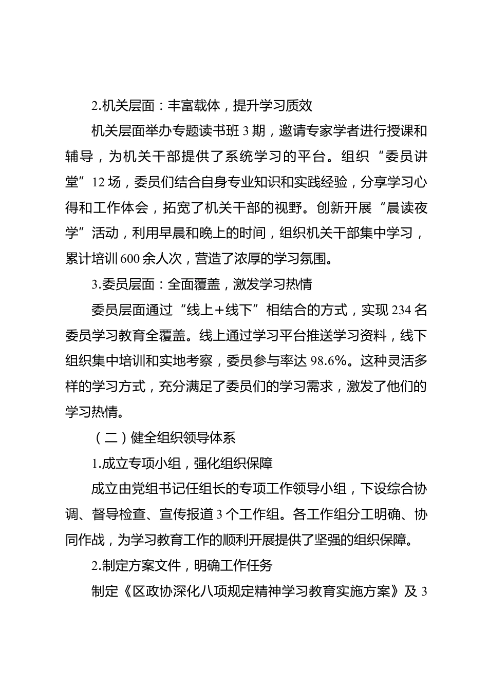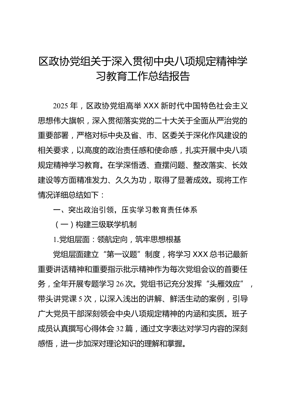 區(qū)政協(xié)黨組關(guān)于深入貫徹中央八項規(guī)定精神學習教育工作總結(jié)報告2025年,區(qū)政協(xié)黨組高舉XXX新時代中國特色社會主義思想偉大旗幟,深入貫徹落實黨的二十大關(guān)于全面從嚴治黨的重要部署,嚴格對標中央及省、市、區(qū)委關(guān)于深化作風建設(shè)的相關(guān)要求,以高度的政治責任感和使命感,扎實開展中央八項規(guī)定精神學習教育。在學深悟透、查擺問題、整改落實、長效建設(shè)等方面精準發(fā)力、久久為功,取得了顯著成效?,F(xiàn)將工作情況詳細總結(jié)如下:一、突出政治引領(lǐng),壓實學習教育責任體系(一)構(gòu)建三級聯(lián)學機制1.黨組層面:領(lǐng)航定向,筑牢思想根基黨組層面建立“第一議題”制度,將學習XXX總書...
