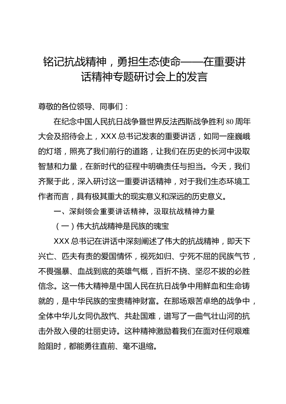 銘記抗戰(zhàn)精神,勇?lián)鷳B(tài)使命——在重要講話精神專題研討會(huì)上的發(fā)言尊敬的各位領(lǐng)導(dǎo)、同事們:在紀(jì)念中國(guó)人民抗日戰(zhàn)爭(zhēng)暨世界反法西斯戰(zhàn)爭(zhēng)勝利80周年大會(huì)及招待會(huì)上,XXX總書記發(fā)表的重要講話,如同一座巍峨的燈塔,照亮了我們前行的道路,讓我們?cè)跉v史的長(zhǎng)河中汲取智慧和力量,在新時(shí)代的征程中明確責(zé)任與擔(dān)當(dāng)。今天,我們齊聚于此,深入研討這一重要講話精神,對(duì)于我們生態(tài)環(huán)境工作者而言,具有極其重大的現(xiàn)實(shí)意義和深遠(yuǎn)的歷史意義。一、深刻領(lǐng)會(huì)重要講話精神,汲取抗戰(zhàn)精神力量(一)偉大抗戰(zhàn)精神是民族的瑰寶XXX總書記在講話中深刻闡述了偉大的抗戰(zhàn)精神,即天下興亡、匹...