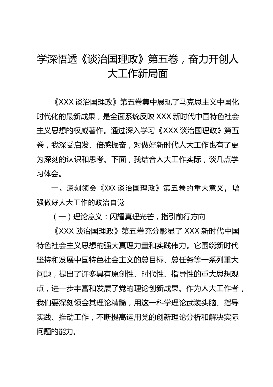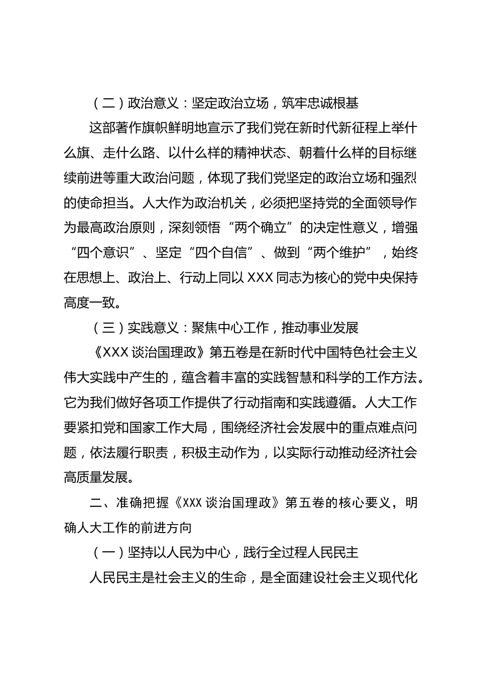學(xué)深悟透《談治國理政》第五卷,奮力開創(chuàng)人大工作新局面《XXX談治國理政》第五卷集中展現(xiàn)了馬克思主義中國化時代化的最新成果,是全面系統(tǒng)反映XXX新時代中國特色社會主義思想的權(quán)威著作。通過深入學(xué)習(xí)《XXX談治國理政》第五卷,我深受啟發(fā)、倍感振奮,對做好新時代人大工作也有了更為深刻的認(rèn)識和思考。下面,我結(jié)合人大工作實際,談幾點學(xué)習(xí)體會。一、深刻領(lǐng)會《XXX談治國理政》第五卷的重大意義,增強(qiáng)做好人大工作的政治自覺(一)理論意義:閃耀真理光芒,指引前行方向《XXX談治國理政》第五卷充分彰顯了XXX新時代中國特色社會主義思想的強(qiáng)大真理力量和實踐偉力。它圍...