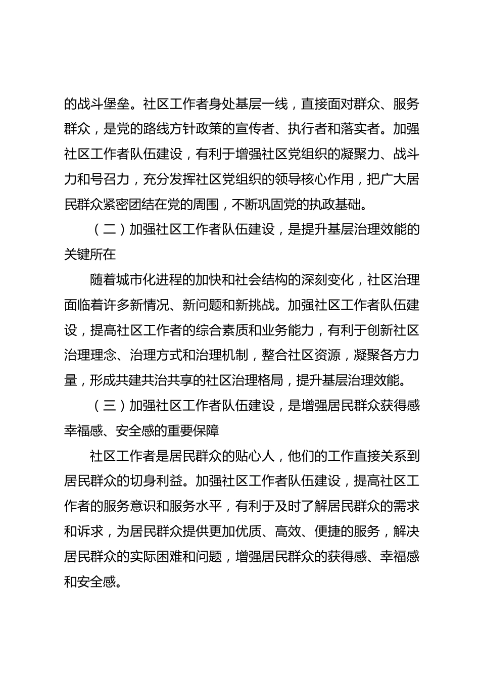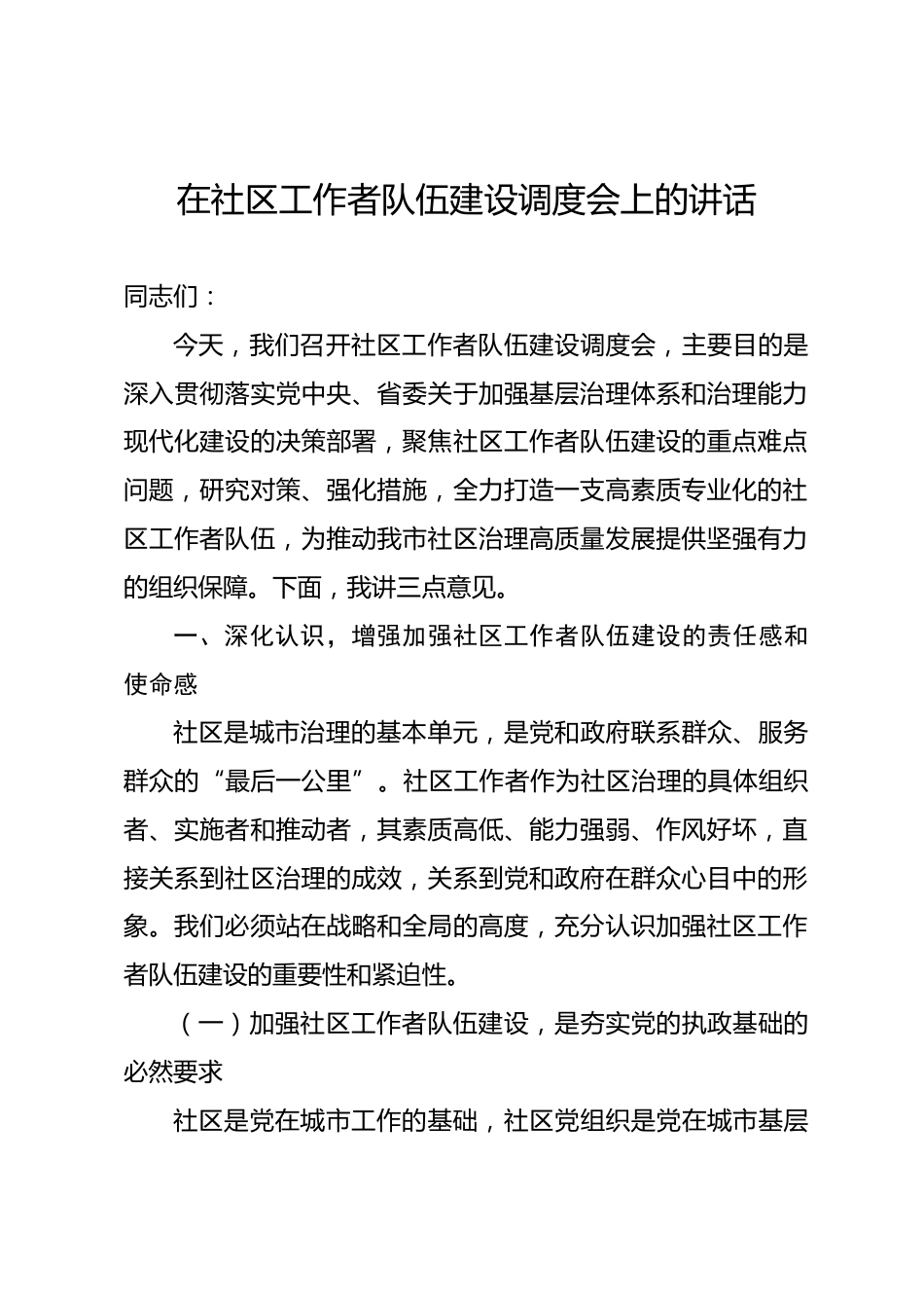 在社區(qū)工作者隊(duì)伍建設(shè)調(diào)度會上的講話同志們:今天,我們召開社區(qū)工作者隊(duì)伍建設(shè)調(diào)度會,主要目的是深入貫徹落實(shí)黨中央、省委關(guān)于加強(qiáng)基層治理體系和治理能力現(xiàn)代化建設(shè)的決策部署,聚焦社區(qū)工作者隊(duì)伍建設(shè)的重點(diǎn)難點(diǎn)問題,研究對策、強(qiáng)化措施,全力打造一支高素質(zhì)專業(yè)化的社區(qū)工作者隊(duì)伍,為推動我市社區(qū)治理高質(zhì)量發(fā)展提供堅(jiān)強(qiáng)有力的組織保障。下面,我講三點(diǎn)意見。一、深化認(rèn)識,增強(qiáng)加強(qiáng)社區(qū)工作者隊(duì)伍建設(shè)的責(zé)任感和使命感社區(qū)是城市治理的基本單元,是黨和政府聯(lián)系群眾、服務(wù)群眾的“最后一公里”。社區(qū)工作者作為社區(qū)治理的具體組織者、實(shí)施者和推動者,其素質(zhì)高低...