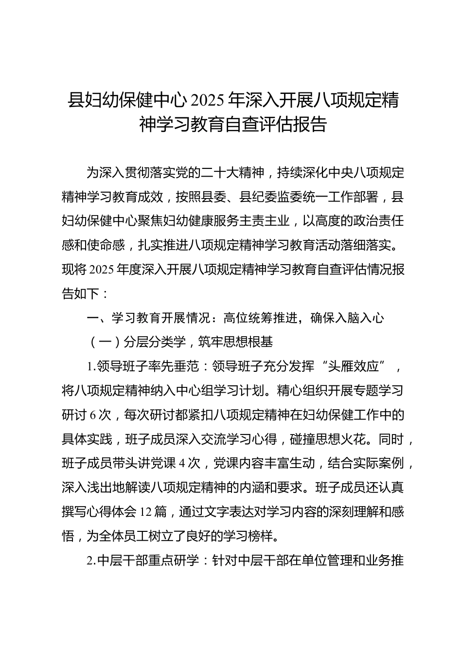 縣婦幼保健中心2025年深入開展八項規(guī)定精神學(xué)習(xí)教育自查評估報告