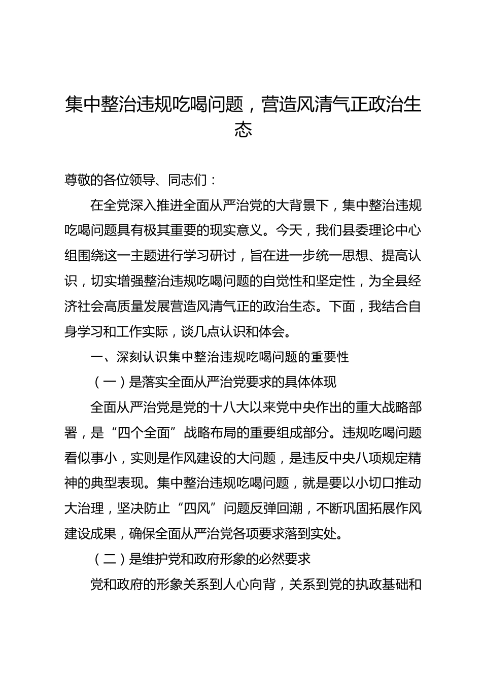 集中整治違規(guī)吃喝問(wèn)題,營(yíng)造風(fēng)清氣正政治生態(tài)尊敬的各位領(lǐng)導(dǎo)、同志們:在全黨深入推進(jìn)全面從嚴(yán)治黨的大背景下,集中整治違規(guī)吃喝問(wèn)題具有極其重要的現(xiàn)實(shí)意義。今天,我們縣委理論中心組圍繞這一主題進(jìn)行學(xué)習(xí)研討,旨在進(jìn)一步統(tǒng)一思想、提高認(rèn)識(shí),切實(shí)增強(qiáng)整治違規(guī)吃喝問(wèn)題的自覺(jué)性和堅(jiān)定性,為全縣經(jīng)濟(jì)社會(huì)高質(zhì)量發(fā)展?fàn)I造風(fēng)清氣正的政治生態(tài)。下面,我結(jié)合自身學(xué)習(xí)和工作實(shí)際,談幾點(diǎn)認(rèn)識(shí)和體會(huì)。一、深刻認(rèn)識(shí)集中整治違規(guī)吃喝問(wèn)題的重要性(一)是落實(shí)全面從嚴(yán)治黨要求的具體體現(xiàn)全面從嚴(yán)治黨是黨的十八大以來(lái)黨中央作出的重大戰(zhàn)略部署,是“四個(gè)全面”戰(zhàn)略布局的重要組...