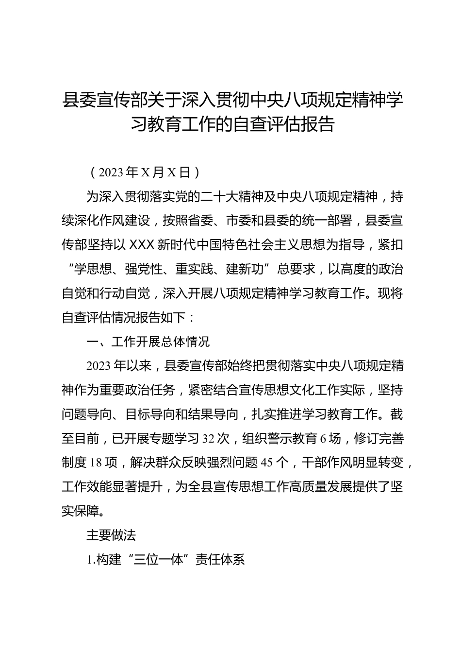 縣委宣傳部關于深入貫徹中央八項規(guī)定精神學習教育工作的自查評估報告(2023年X月X日)為深入貫徹落實黨的二十大精神及中央八項規(guī)定精神,持續(xù)深化作風建設,按照省委、市委和縣委的統(tǒng)一部署,縣委宣傳部堅持以XXX新時代中國特色社會主義思想為指導,緊扣“學思想、強黨性、重實踐、建新功”總要求,以高度的政治自覺和行動自覺,深入開展八項規(guī)定精神學習教育工作?,F將自查評估情況報告如下:一、工作開展總體情況2023年以來,縣委宣傳部始終把貫徹落實中央八項規(guī)定精神作為重要政治任務,緊密結合宣傳思想文化工作實際,堅持問題導向、目標導向和結果導向,扎實推進學...