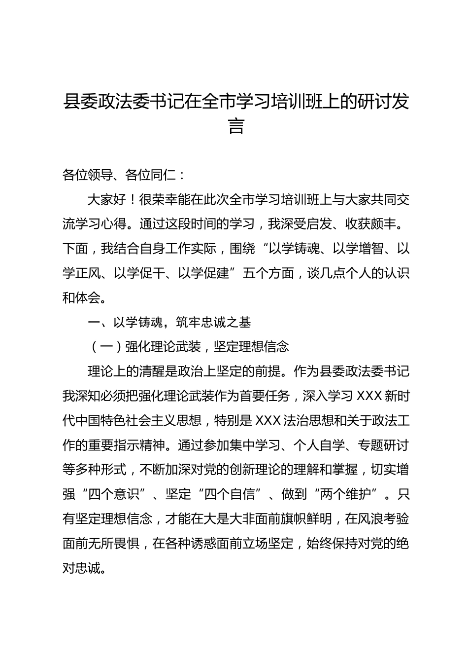 縣委政法委書記在全市學(xué)習(xí)培訓(xùn)班上的研討發(fā)言各位領(lǐng)導(dǎo)、各位同仁:大家好!很榮幸能在此次全市學(xué)習(xí)培訓(xùn)班上與大家共同交流學(xué)習(xí)心得。通過這段時間的學(xué)習(xí),我深受啟發(fā)、收獲頗豐。下面,我結(jié)合自身工作實(shí)際,圍繞“以學(xué)鑄魂、以學(xué)增智、以學(xué)正風(fēng)、以學(xué)促干、以學(xué)促建”五個方面,談幾點(diǎn)個人的認(rèn)識和體會。一、以學(xué)鑄魂,筑牢忠誠之基(一)強(qiáng)化理論武裝,堅(jiān)定理想信念理論上的清醒是政治上堅(jiān)定的前提。作為縣委政法委書記我深知必須把強(qiáng)化理論武裝作為首要任務(wù),深入學(xué)習(xí)XXX新時代中國特色社會主義思想,特別是XXX法治思想和關(guān)于政法工作的重要指示精神。通過參加集中學(xué)習(xí)...