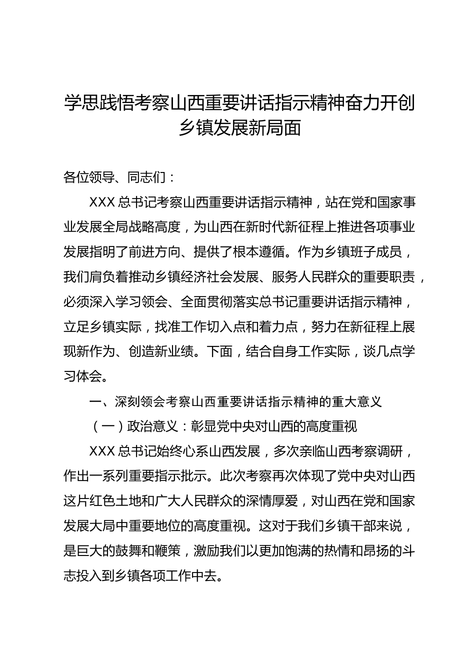 學(xué)思踐悟考察山西重要講話指示精神奮力開創(chuàng)鄉(xiāng)鎮(zhèn)發(fā)展新局面各位領(lǐng)導(dǎo)、同志們:XXX總書記考察山西重要講話指示精神,站在黨和國家事業(yè)發(fā)展全局戰(zhàn)略高度,為山西在新時代新征程上推進(jìn)各項(xiàng)事業(yè)發(fā)展指明了前進(jìn)方向、提供了根本遵循。作為鄉(xiāng)鎮(zhèn)班子成員,我們肩負(fù)著推動鄉(xiāng)鎮(zhèn)經(jīng)濟(jì)社會發(fā)展、服務(wù)人民群眾的重要職責(zé),必須深入學(xué)習(xí)領(lǐng)會、全面貫徹落實(shí)總書記重要講話指示精神,立足鄉(xiāng)鎮(zhèn)實(shí)際,找準(zhǔn)工作切入點(diǎn)和著力點(diǎn),努力在新征程上展現(xiàn)新作為、創(chuàng)造新業(yè)績。下面,結(jié)合自身工作實(shí)際,談幾點(diǎn)學(xué)習(xí)體會。一、深刻領(lǐng)會考察山西重要講話指示精神的重大意義(一)政治意義:彰顯黨中央對...