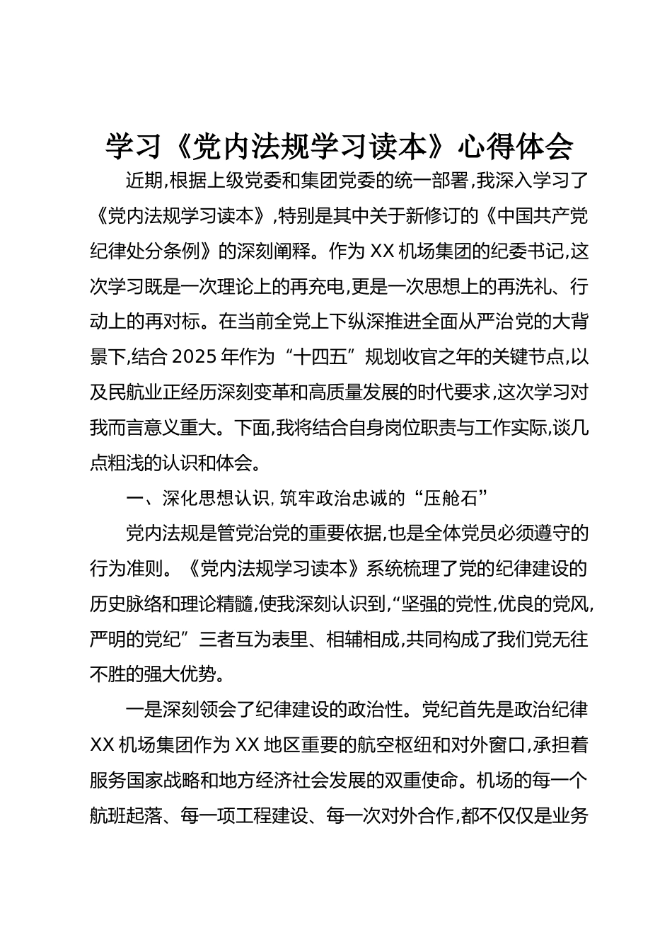 學(xué)習(xí)《黨內(nèi)法規(guī)學(xué)習(xí)讀本》心得體會(huì)近期,根據(jù)上級(jí)黨委和集團(tuán)黨委的統(tǒng)一部署,我深入學(xué)習(xí)了《黨內(nèi)法規(guī)學(xué)習(xí)讀本》,特別是其中關(guān)于新修訂的《中國(guó)共產(chǎn)黨紀(jì)律處分條例》的深刻闡釋。作為XX機(jī)場(chǎng)集團(tuán)的紀(jì)委書記,這次學(xué)習(xí)既是一次理論上的再充電,更是一次思想上的再洗禮、行動(dòng)上的再對(duì)標(biāo)。在當(dāng)前全黨上下縱深推進(jìn)全面從嚴(yán)治黨的大背景下,結(jié)合2025年作為“十四五”規(guī)劃收官之年的關(guān)鍵節(jié)點(diǎn),以及民航業(yè)正經(jīng)歷深刻變革和高質(zhì)量發(fā)展的時(shí)代要求,這次學(xué)習(xí)對(duì)我而言意義重大。下面,我將結(jié)合自身崗位職責(zé)與工作實(shí)際,談幾點(diǎn)粗淺的認(rèn)識(shí)和體會(huì)。一、深化思想認(rèn)識(shí),筑牢政治忠誠(chéng)的“壓艙石”黨內(nèi)...