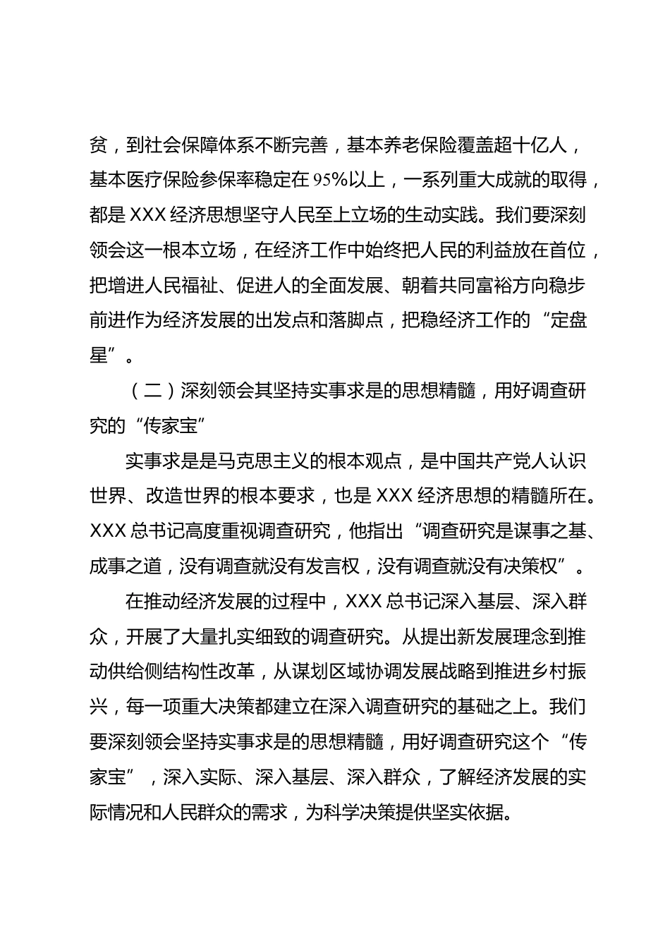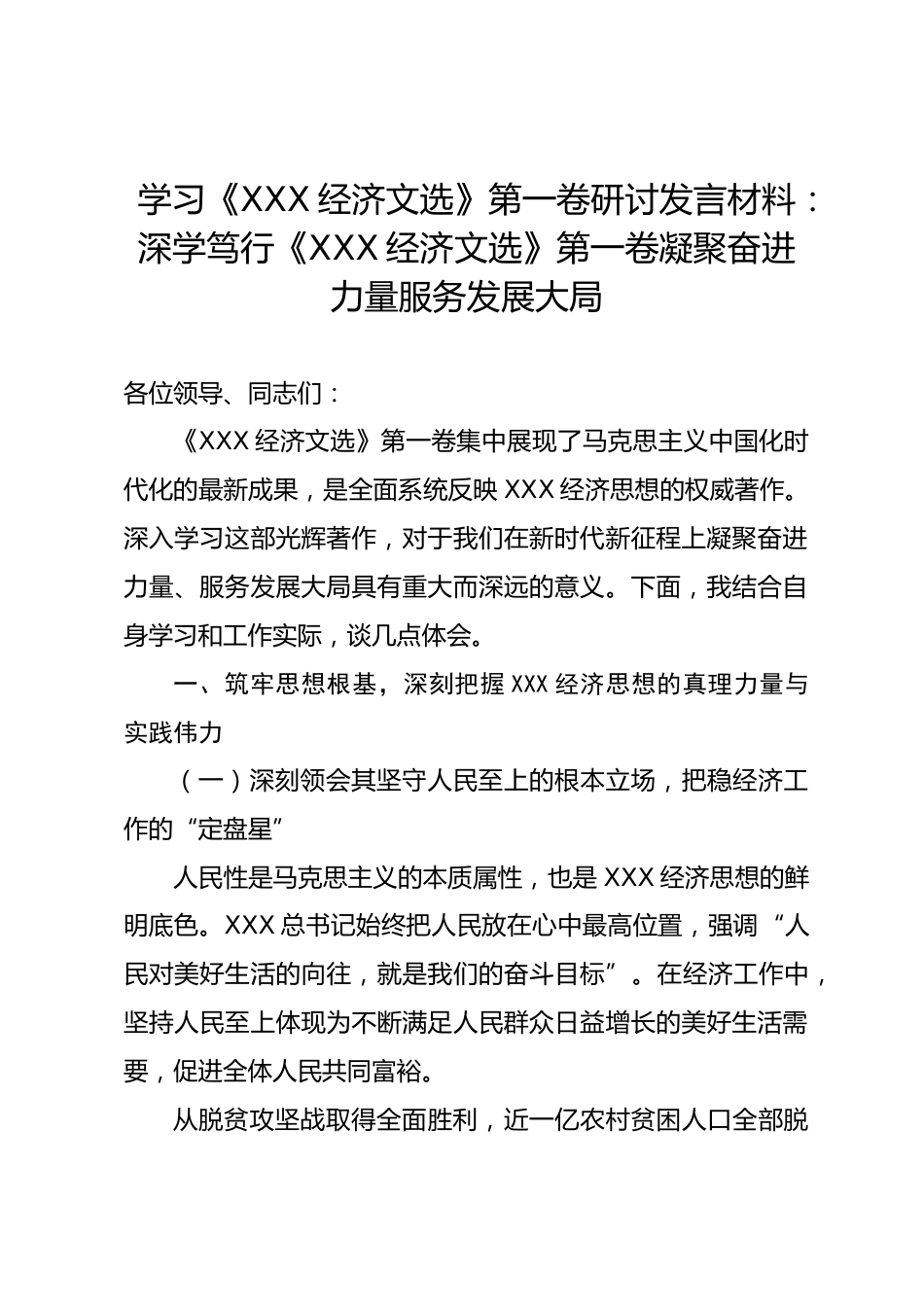 學(xué)習(xí)《XXX經(jīng)濟(jì)文選》第一卷研討發(fā)言材料:深學(xué)篤行《XXX經(jīng)濟(jì)文選》第一卷凝聚奮進(jìn)力量服務(wù)發(fā)展大局各位領(lǐng)導(dǎo)、同志們:《XXX經(jīng)濟(jì)文選》第一卷集中展現(xiàn)了馬克思主義中國化時(shí)代化的最新成果,是全面系統(tǒng)反映XXX經(jīng)濟(jì)思想的權(quán)威著作。深入學(xué)習(xí)這部光輝著作,對(duì)于我們在新時(shí)代新征程上凝聚奮進(jìn)力量、服務(wù)發(fā)展大局具有重大而深遠(yuǎn)的意義。下面,我結(jié)合自身學(xué)習(xí)和工作實(shí)際,談幾點(diǎn)體會(huì)。一、筑牢思想根基,深刻把握XXX經(jīng)濟(jì)思想的真理力量與實(shí)踐偉力(一)深刻領(lǐng)會(huì)其堅(jiān)守人民至上的根本立場,把穩(wěn)經(jīng)濟(jì)工作的“定盤星”人民性是馬克思主義的本質(zhì)屬性,也是XXX經(jīng)濟(jì)思想的鮮明底色。XX...