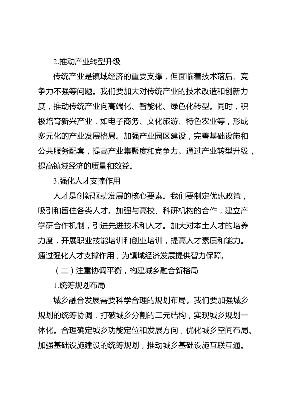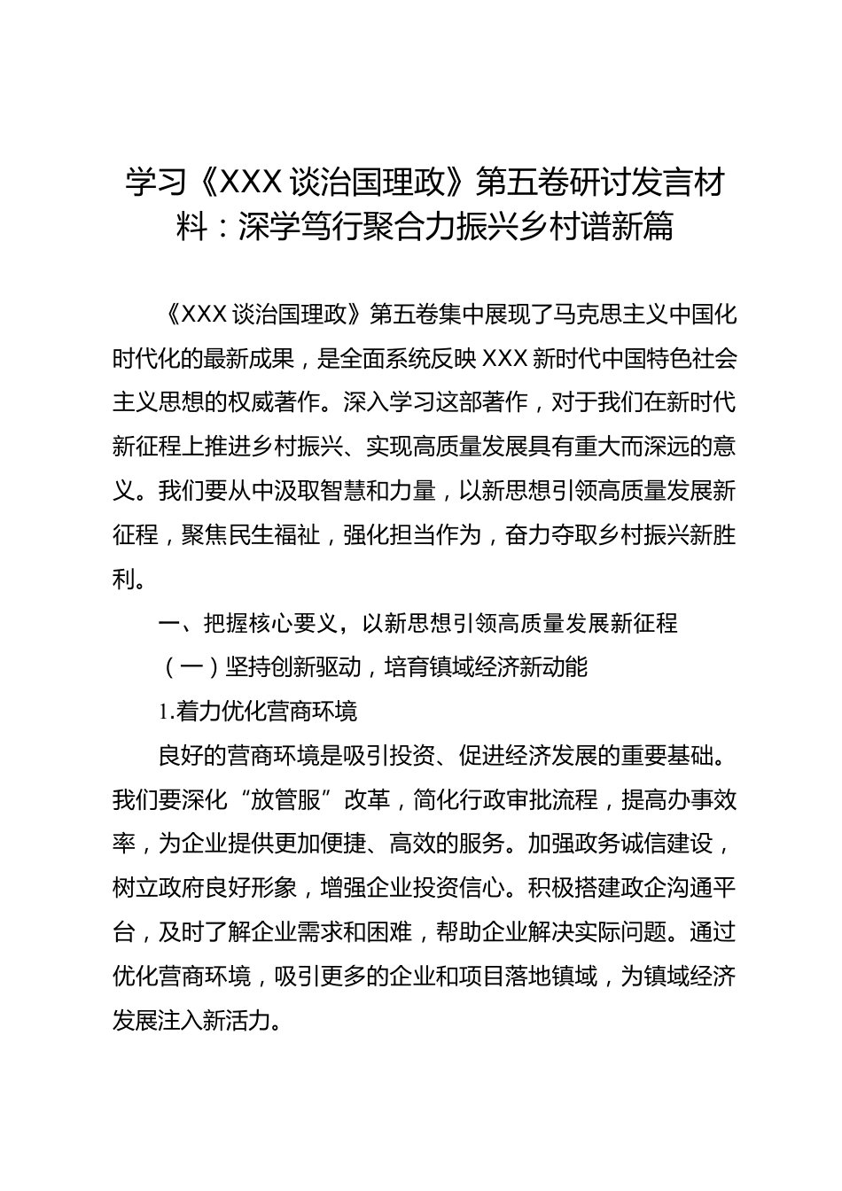 學(xué)習(xí)《XXX談治國(guó)理政》第五卷研討發(fā)言材料:深學(xué)篤行聚合力振興鄉(xiāng)村譜新篇《XXX談治國(guó)理政》第五卷集中展現(xiàn)了馬克思主義中國(guó)化時(shí)代化的最新成果,是全面系統(tǒng)反映XXX新時(shí)代中國(guó)特色社會(huì)主義思想的權(quán)威著作。深入學(xué)習(xí)這部著作,對(duì)于我們?cè)谛聲r(shí)代新征程上推進(jìn)鄉(xiāng)村振興、實(shí)現(xiàn)高質(zhì)量發(fā)展具有重大而深遠(yuǎn)的意義。我們要從中汲取智慧和力量,以新思想引領(lǐng)高質(zhì)量發(fā)展新征程,聚焦民生福祉,強(qiáng)化擔(dān)當(dāng)作為,奮力奪取鄉(xiāng)村振興新勝利。一、把握核心要義,以新思想引領(lǐng)高質(zhì)量發(fā)展新征程(一)堅(jiān)持創(chuàng)新驅(qū)動(dòng),培育鎮(zhèn)域經(jīng)濟(jì)新動(dòng)能1.著力優(yōu)化營(yíng)商環(huán)境良好的營(yíng)商環(huán)境是吸引投資、促進(jìn)經(jīng)濟(jì)發(fā)...