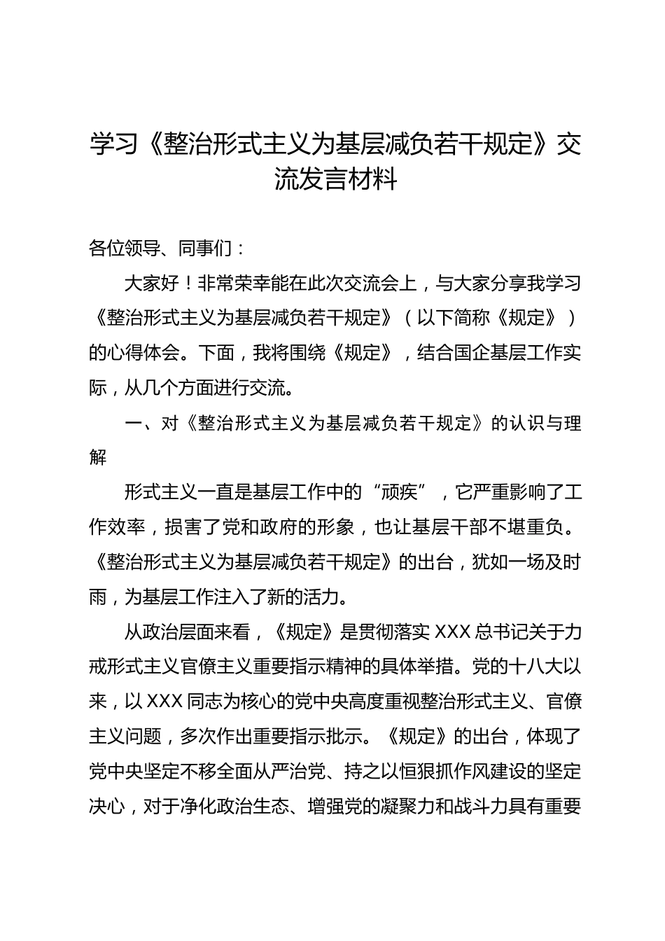 學(xué)習(xí)《整治形式主義為基層減負(fù)若干規(guī)定》交流發(fā)言材料
