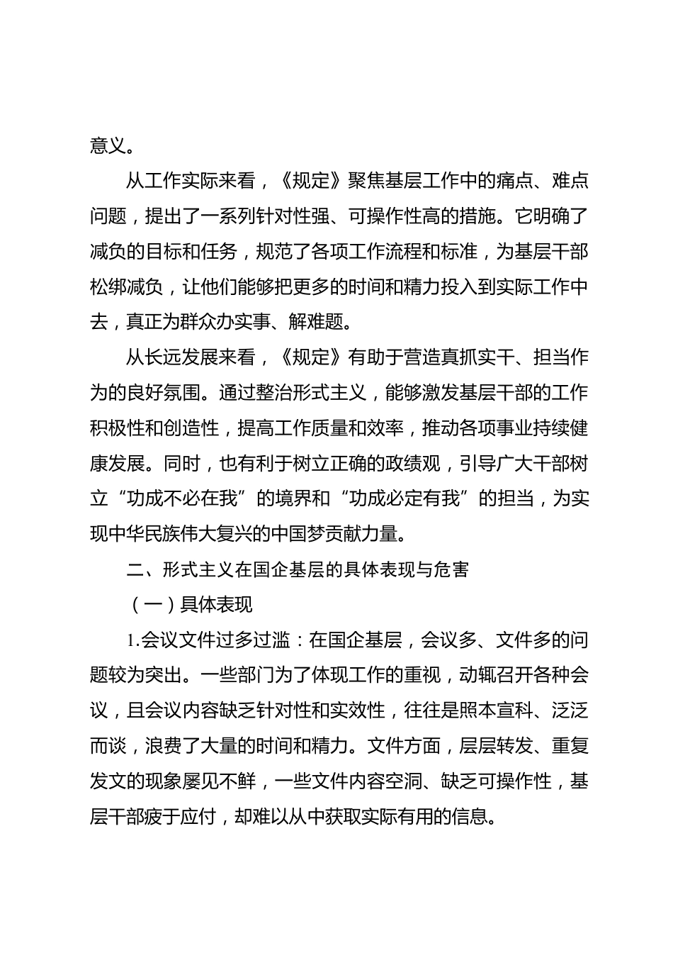 學(xué)習(xí)《整治形式主義為基層減負(fù)若干規(guī)定》交流發(fā)言材料各位領(lǐng)導(dǎo)、同事們:大家好!非常榮幸能在此次交流會(huì)上,與大家分享我學(xué)習(xí)《整治形式主義為基層減負(fù)若干規(guī)定》(以下簡(jiǎn)稱《規(guī)定》)的心得體會(huì)。下面,我將圍繞《規(guī)定》,結(jié)合國(guó)企基層工作實(shí)際,從幾個(gè)方面進(jìn)行交流。一、對(duì)《整治形式主義為基層減負(fù)若干規(guī)定》的認(rèn)識(shí)與理解形式主義一直是基層工作中的“頑疾”,它嚴(yán)重影響了工作效率,損害了黨和政府的形象,也讓基層干部不堪重負(fù)。《整治形式主義為基層減負(fù)若干規(guī)定》的出臺(tái),猶如一場(chǎng)及時(shí)雨,為基層工作注入了新的活力。從政治層面來(lái)看,《規(guī)定》是貫徹落實(shí)XXX總書(shū)...