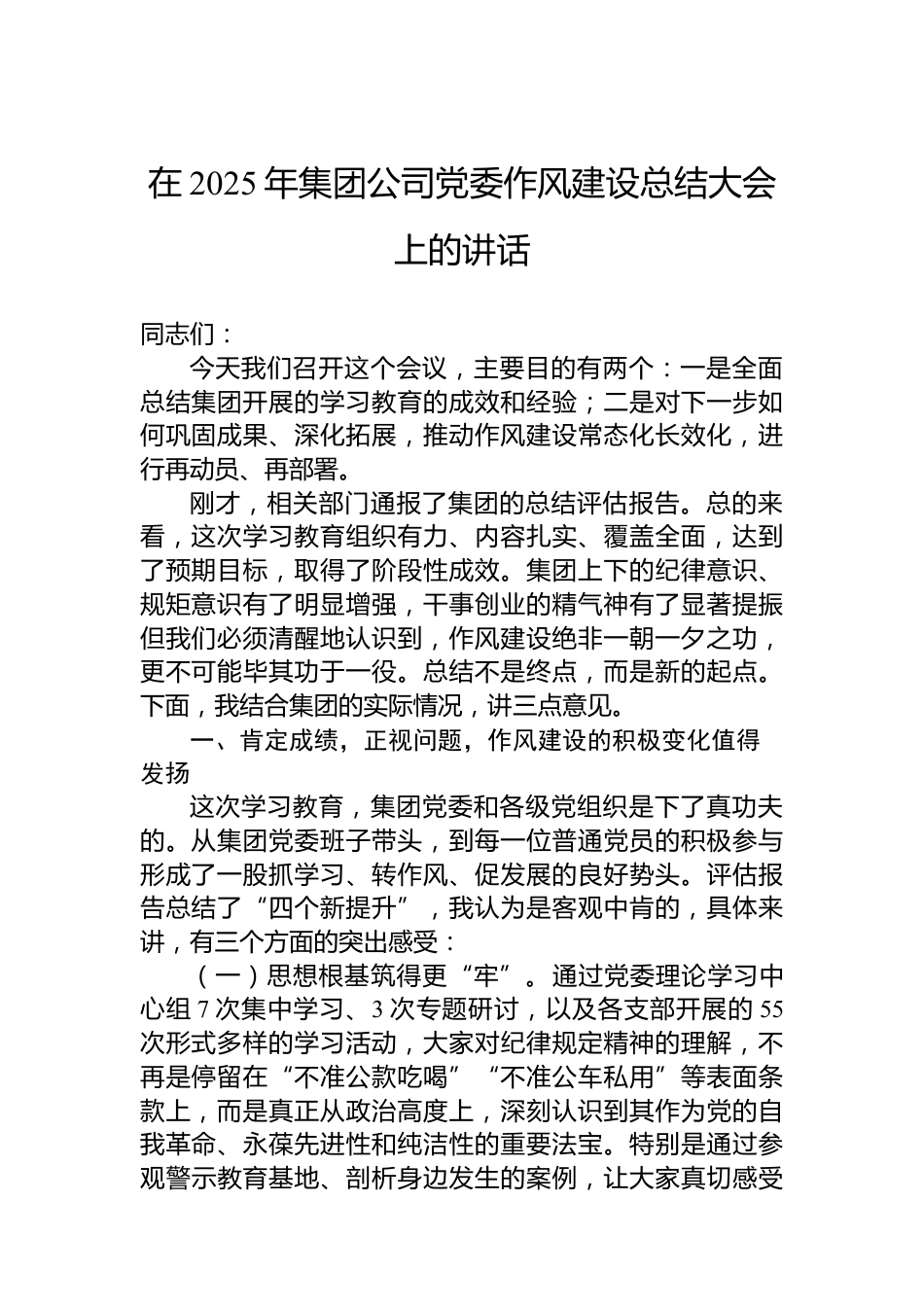在2025年集團公司黨委作風建設(shè)總結(jié)大會上的講話同志們:今天我們召開這個會議,主要目的有兩個:一是全面總結(jié)集團開展的學習教育的成效和經(jīng)驗;二是對下一步如何鞏固成果、深化拓展,推動作風建設(shè)常態(tài)化長效化,進行再動員、再部署。剛才,相關(guān)部門通報了集團的總結(jié)評估報告??偟膩砜?,這次學習教育組織有力、內(nèi)容扎實、覆蓋全面,達到了預(yù)期目標,取得了階段性成效。集團上下的紀律意識、規(guī)矩意識有了明顯增強,干事創(chuàng)業(yè)的精氣神有了顯著提振但我們必須清醒地認識到,作風建設(shè)絕非一朝一夕之功,更不可能畢其功于一役??偨Y(jié)不是終點,而是新的起點。下面,我結(jié)合集團的...