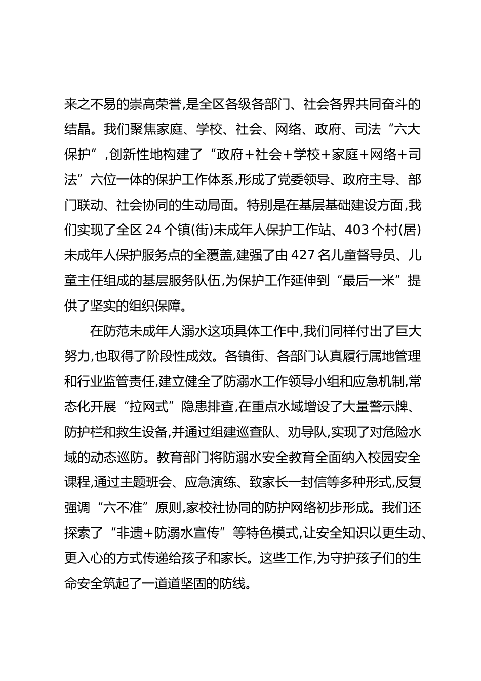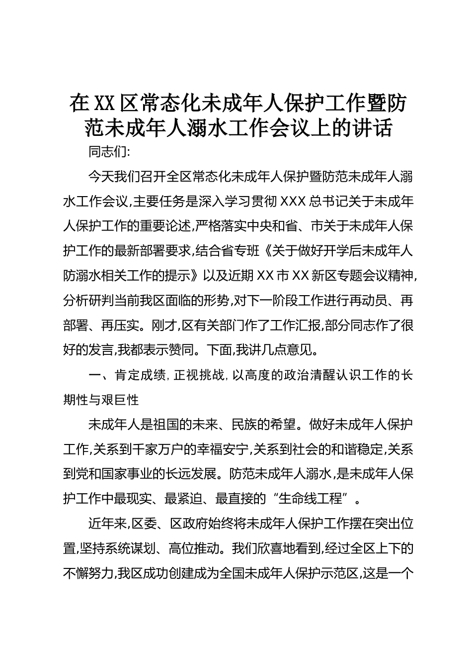 在XX區(qū)常態(tài)化未成年人保護(hù)工作暨防范未成年人溺水工作會議上的講話同志們:今天我們召開全區(qū)常態(tài)化未成年人保護(hù)暨防范未成年人溺水工作會議,主要任務(wù)是深入學(xué)習(xí)貫徹XXX總書記關(guān)于未成年人保護(hù)工作的重要論述,嚴(yán)格落實中央和省、市關(guān)于未成年人保護(hù)工作的最新部署要求,結(jié)合省專班《關(guān)于做好開學(xué)后未成年人防溺水相關(guān)工作的提示》以及近期XX市XX新區(qū)專題會議精神,分析研判當(dāng)前我區(qū)面臨的形勢,對下一階段工作進(jìn)行再動員、再部署、再壓實。剛才,區(qū)有關(guān)部門作了工作匯報,部分同志作了很好的發(fā)言,我都表示贊同。下面,我講幾點意見。一、肯定成績,正視挑戰(zhàn),以高度的政治清醒認(rèn)識...