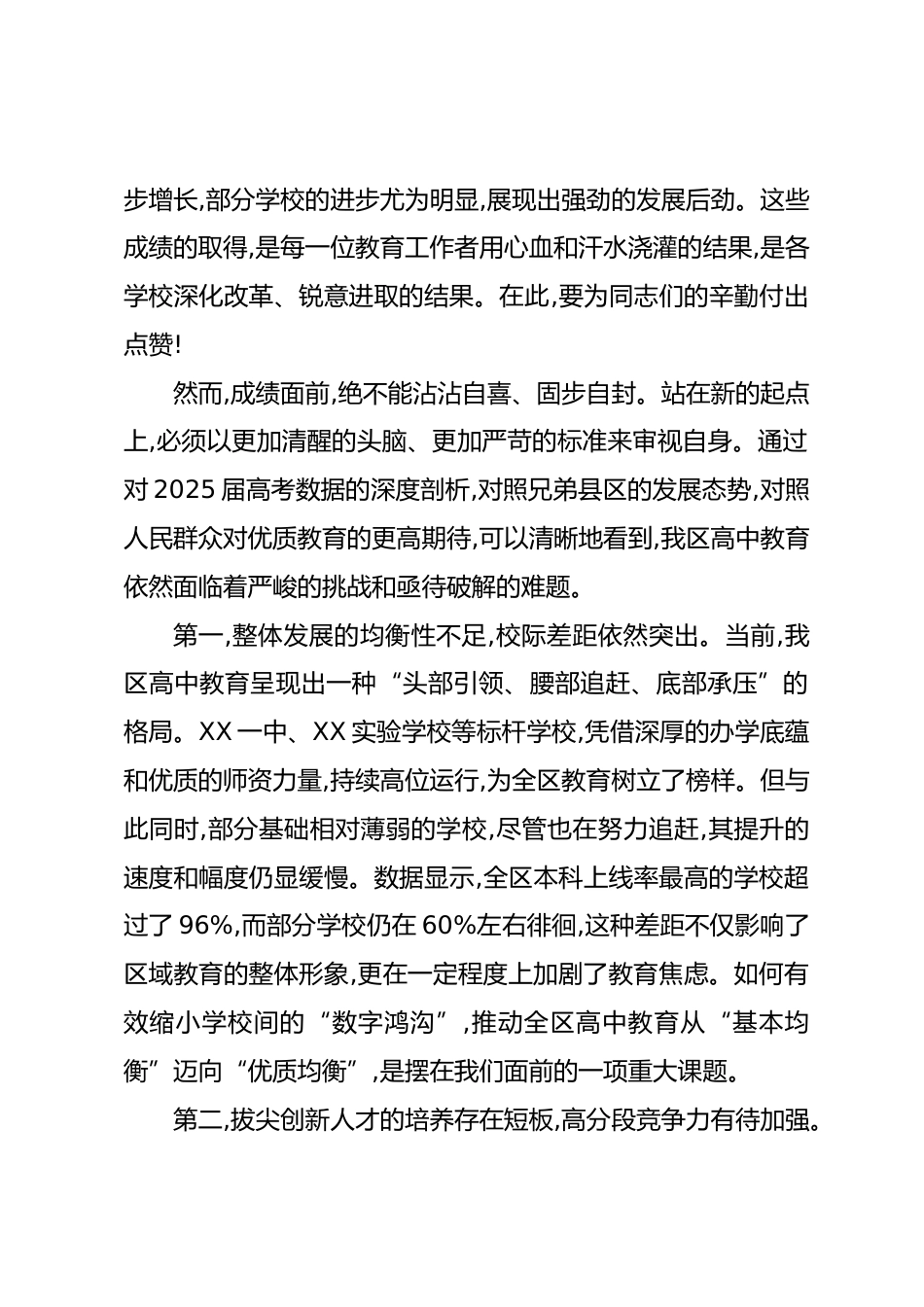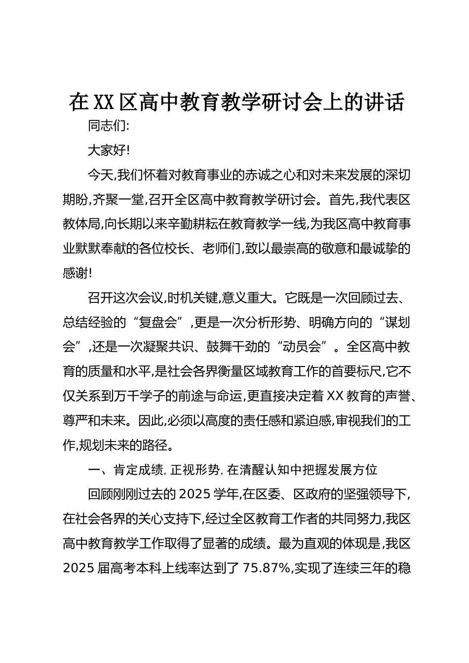 在XX區(qū)高中教育教學研討會上的講話同志們:大家好!今天,我們懷著對教育事業(yè)的赤誠之心和對未來發(fā)展的深切期盼,齊聚一堂,召開全區(qū)高中教育教學研討會。首先,我代表區(qū)教體局,向長期以來辛勤耕耘在教育教學一線,為我區(qū)高中教育事業(yè)默默奉獻的各位校長、老師們,致以最崇高的敬意和最誠摯的感謝!召開這次會議,時機關鍵,意義重大。它既是一次回顧過去、總結經(jīng)驗的“復盤會”,更是一次分析形勢、明確方向的“謀劃會”,還是一次凝聚共識、鼓舞干勁的“動員會”。全區(qū)高中教育的質量和水平,是社會各界衡量區(qū)域教育工作的首要標尺,它不僅關系到萬千學子的前途與命運,更直接決定著XX...