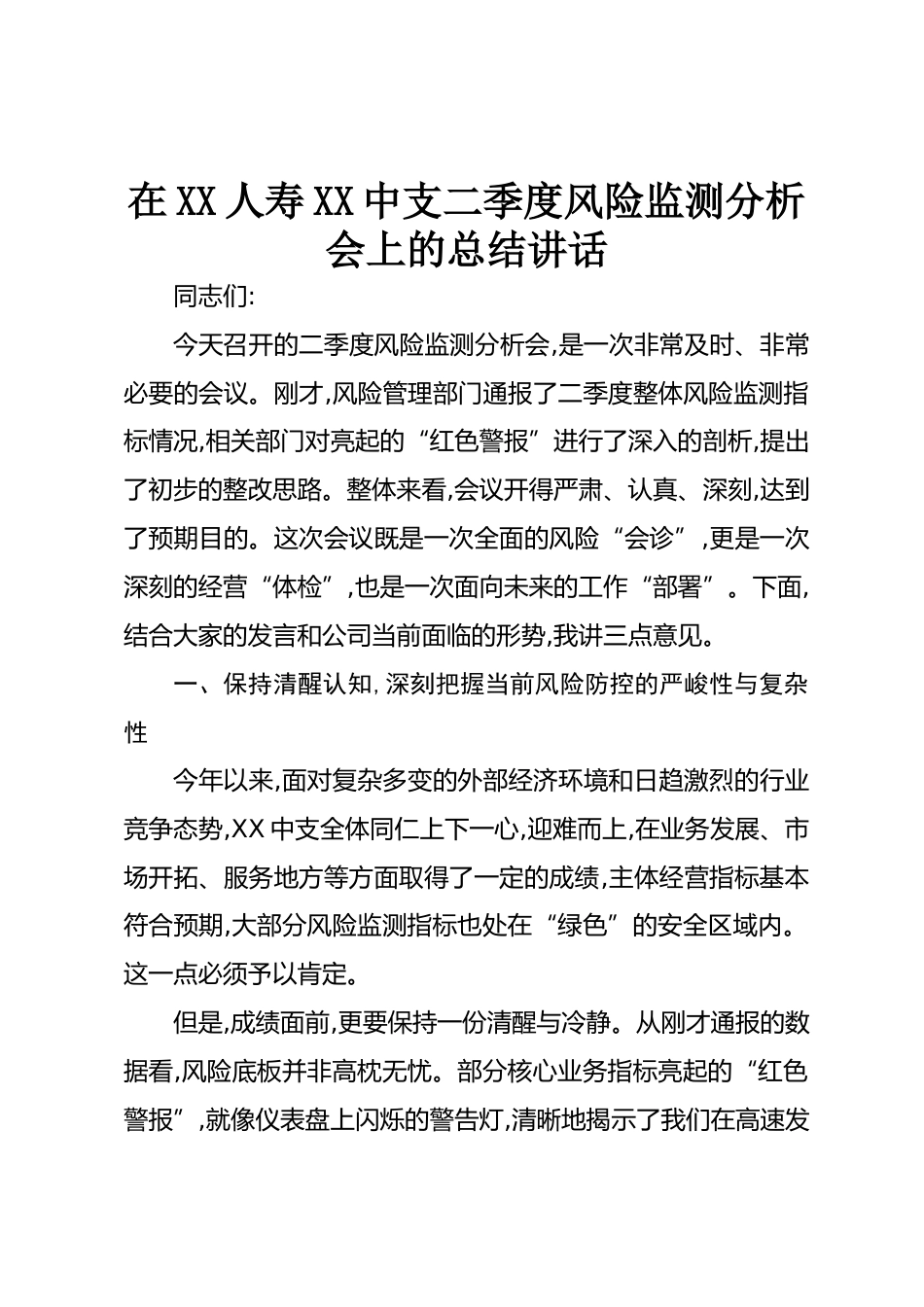 在XX人壽XX中支二季度風(fēng)險(xiǎn)監(jiān)測(cè)分析會(huì)上的總結(jié)講話(huà)