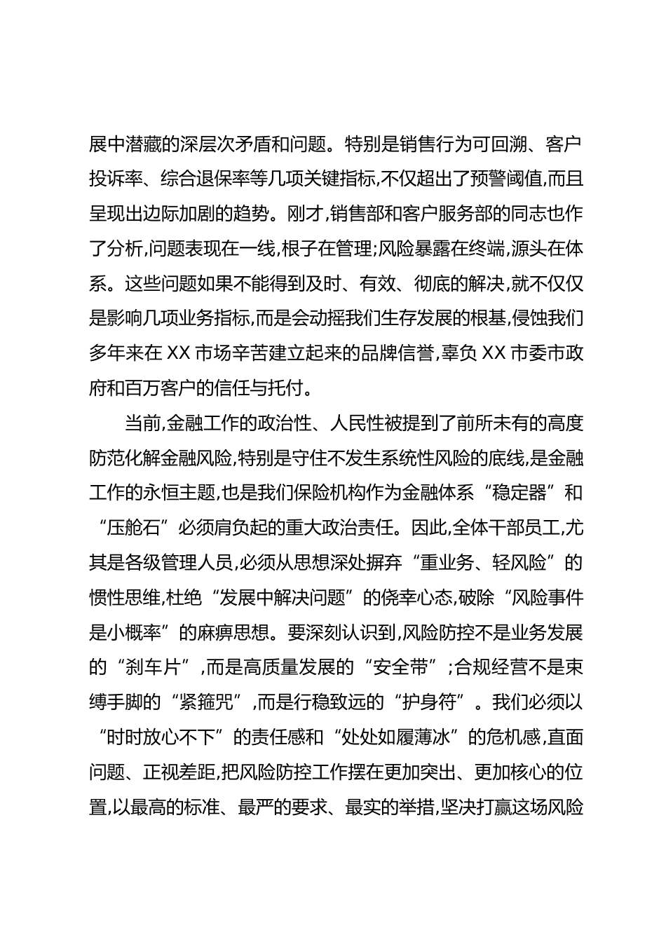 在XX人壽XX中支二季度風(fēng)險(xiǎn)監(jiān)測(cè)分析會(huì)上的總結(jié)講話(huà)同志們:今天召開(kāi)的二季度風(fēng)險(xiǎn)監(jiān)測(cè)分析會(huì),是一次非常及時(shí)、非常必要的會(huì)議。剛才,風(fēng)險(xiǎn)管理部門(mén)通報(bào)了二季度整體風(fēng)險(xiǎn)監(jiān)測(cè)指標(biāo)情況,相關(guān)部門(mén)對(duì)亮起的“紅色警報(bào)”進(jìn)行了深入的剖析,提出了初步的整改思路。整體來(lái)看,會(huì)議開(kāi)得嚴(yán)肅、認(rèn)真、深刻,達(dá)到了預(yù)期目的。這次會(huì)議既是一次全面的風(fēng)險(xiǎn)“會(huì)診”,更是一次深刻的經(jīng)營(yíng)“體檢”,也是一次面向未來(lái)的工作“部署”。下面,結(jié)合大家的發(fā)言和公司當(dāng)前面臨的形勢(shì),我講三點(diǎn)意見(jiàn)。一、保持清醒認(rèn)知,深刻把握當(dāng)前風(fēng)險(xiǎn)防控的嚴(yán)峻性與復(fù)雜性今年以來(lái),面對(duì)復(fù)雜多變的外部經(jīng)濟(jì)環(huán)境和日趨激烈...