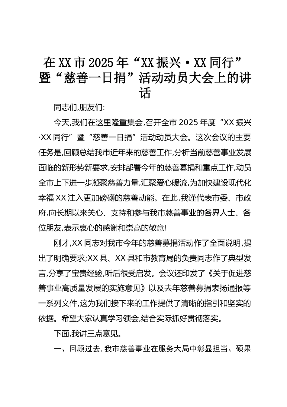 在XX市2025年“XX振興·XX同行”暨“慈善一日捐”活動(dòng)動(dòng)員大會(huì)上的講話