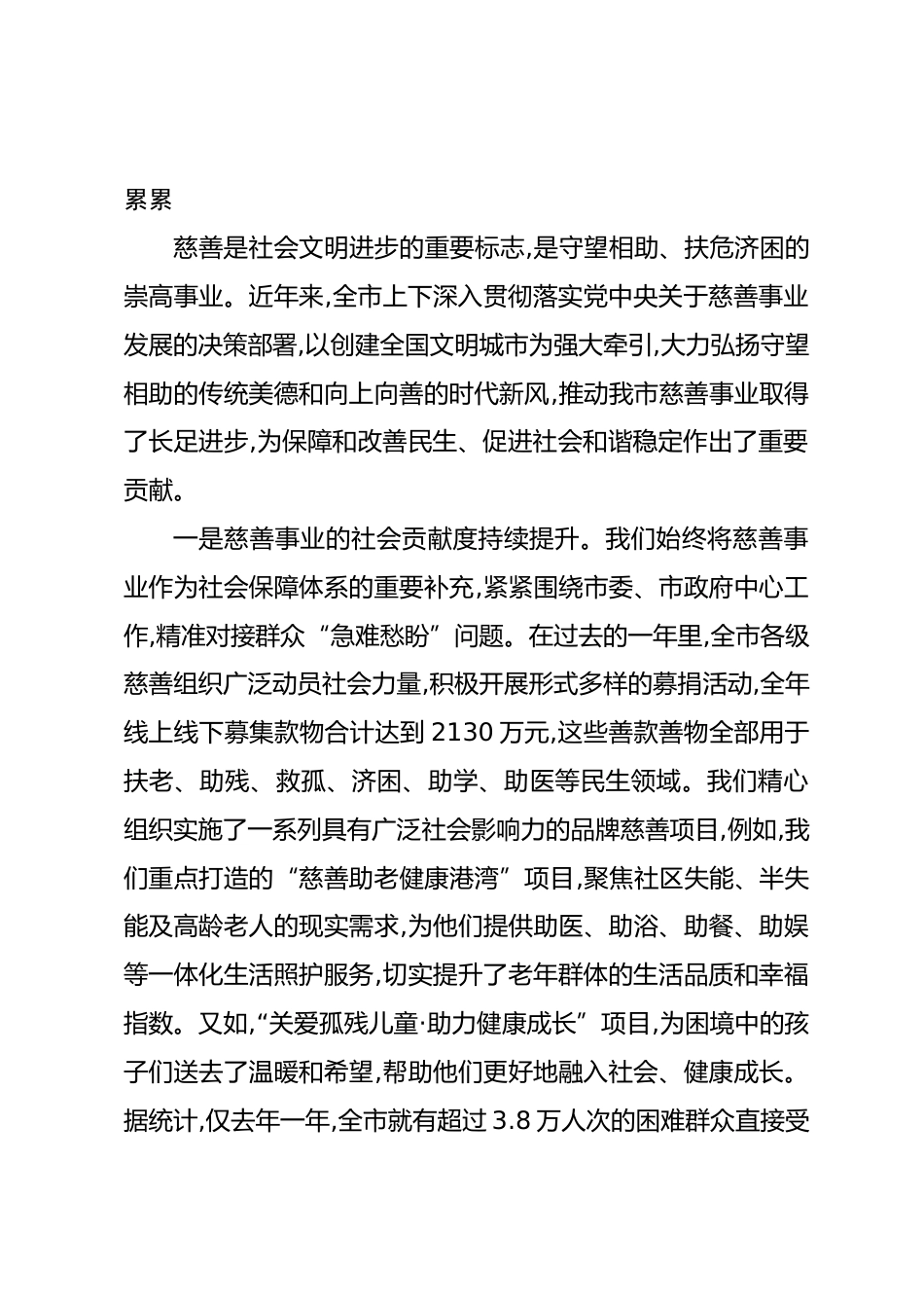 在XX市2025年“XX振興·XX同行”暨“慈善一日捐”活動(dòng)動(dòng)員大會(huì)上的講話同志們,朋友們:今天,我們?cè)谶@里隆重集會(huì),召開全市2025年度“XX振興·XX同行”暨“慈善一日捐”活動(dòng)動(dòng)員大會(huì)。這次會(huì)議的主要任務(wù)是,回顧總結(jié)我市近年來的慈善工作,分析當(dāng)前慈善事業(yè)發(fā)展面臨的新形勢(shì)新要求,安排部署今年的慈善募捐和重點(diǎn)工作,動(dòng)員全市上下進(jìn)一步凝聚慈善力量,匯聚愛心暖流,為加快建設(shè)現(xiàn)代化幸福XX注入更加磅礴的慈善動(dòng)能。在此,我謹(jǐn)代表市委、市政府,向長(zhǎng)期以來關(guān)心、支持和參與我市慈善事業(yè)的各界人士、各位朋友,表示衷心的感謝和崇高的敬意!剛才,XX同志對(duì)我市今年的慈善募捐活動(dòng)作...