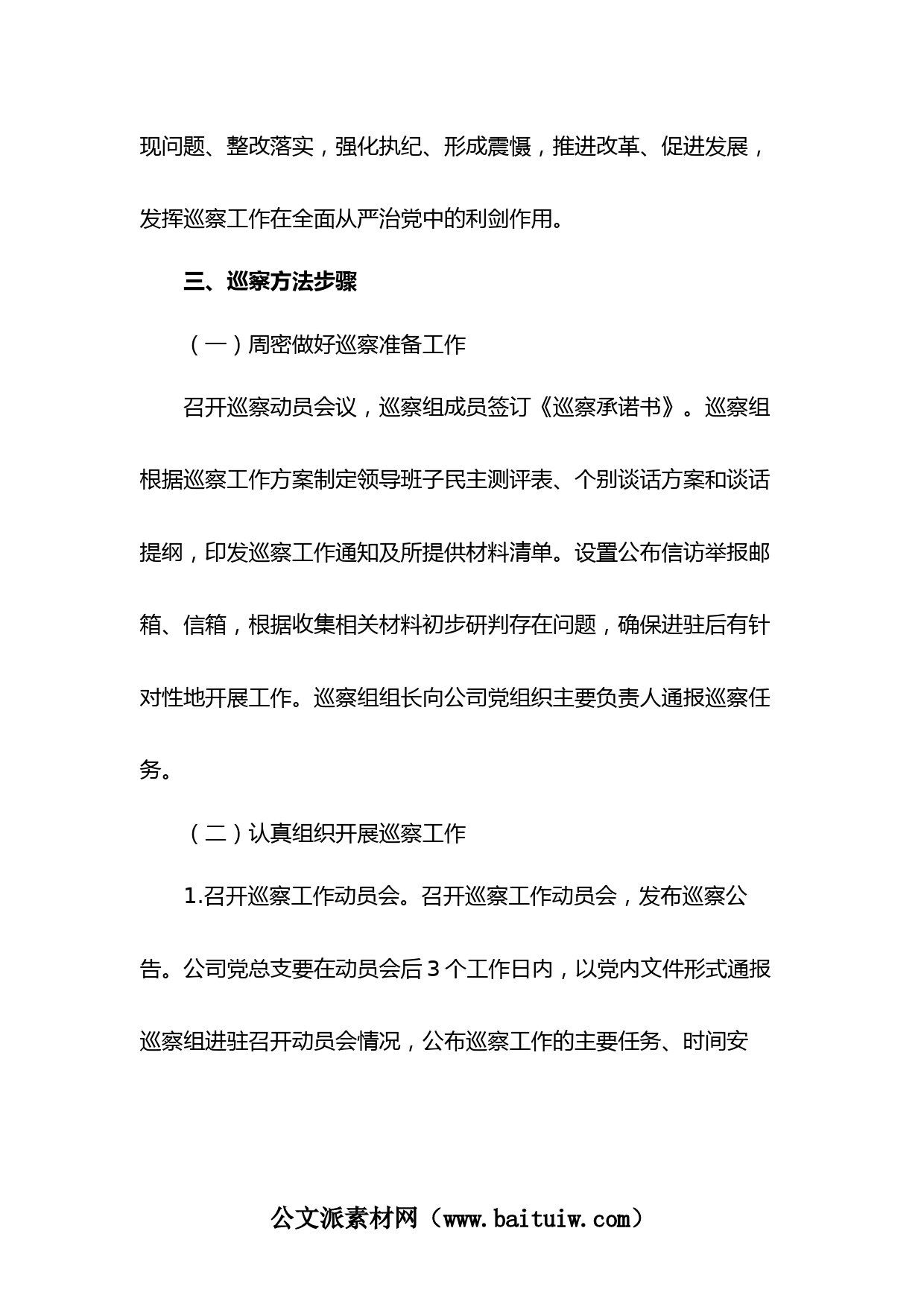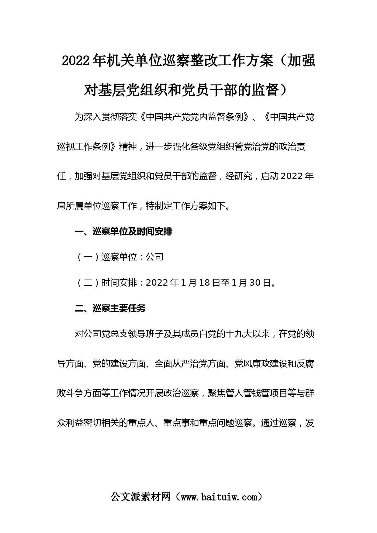 2022年機(jī)關(guān)單位巡察整改工作方案(加強(qiáng)對(duì)基層黨組織和黨員干部的監(jiān)督)為深入貫徹落實(shí)《中國(guó)共產(chǎn)黨黨內(nèi)監(jiān)督條例》、《中國(guó)共產(chǎn)黨巡視工作條例》精神,進(jìn)一步強(qiáng)化各級(jí)黨組織管黨治黨的政治責(zé)任,加強(qiáng)對(duì)基層黨組織和黨員干部的監(jiān)督,經(jīng)研究,啟動(dòng)2022年局所屬單位巡察工作,特制定工作方案如下。一、巡察單位及時(shí)間安排(一)巡察單位:公司(二)時(shí)間安排:2022年1月18日至1月30日。二、巡察主要任務(wù)對(duì)公司黨總支領(lǐng)導(dǎo)班子及其成員自黨的十九大以來(lái),在黨的領(lǐng)導(dǎo)方面、黨的建設(shè)方面、全面從嚴(yán)治黨方面、黨風(fēng)廉政建設(shè)和反腐敗斗爭(zhēng)方面等工作情況開展政治巡察,聚焦管人管錢管...