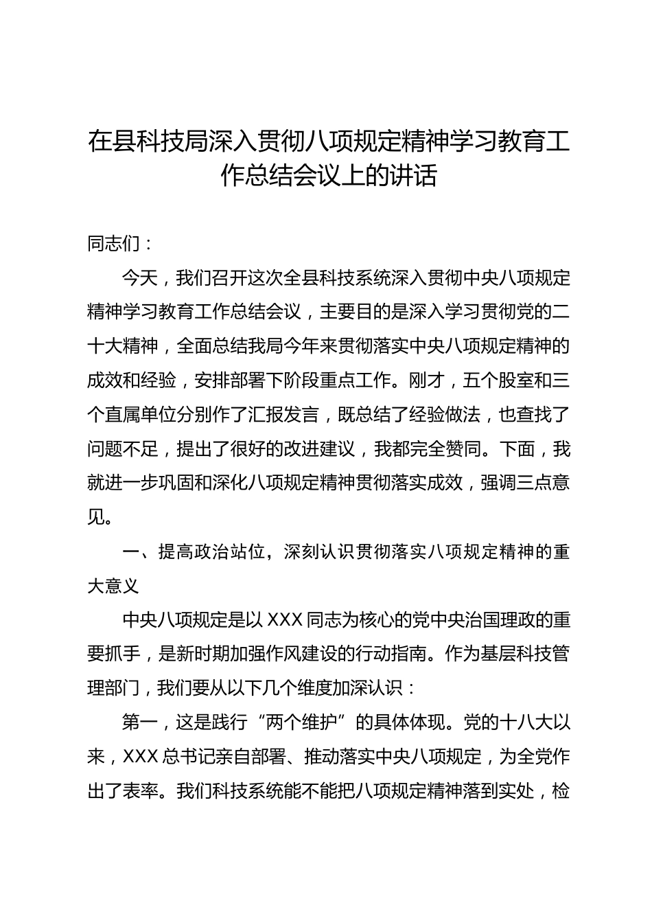 在縣科技局深入貫徹八項(xiàng)規(guī)定精神學(xué)習(xí)教育工作總結(jié)會(huì)議上的講話同志們:今天,我們召開這次全縣科技系統(tǒng)深入貫徹中央八項(xiàng)規(guī)定精神學(xué)習(xí)教育工作總結(jié)會(huì)議,主要目的是深入學(xué)習(xí)貫徹黨的二十大精神,全面總結(jié)我局今年來貫徹落實(shí)中央八項(xiàng)規(guī)定精神的成效和經(jīng)驗(yàn),安排部署下階段重點(diǎn)工作。剛才,五個(gè)股室和三個(gè)直屬單位分別作了匯報(bào)發(fā)言,既總結(jié)了經(jīng)驗(yàn)做法,也查找了問題不足,提出了很好的改進(jìn)建議,我都完全贊同。下面,我就進(jìn)一步鞏固和深化八項(xiàng)規(guī)定精神貫徹落實(shí)成效,強(qiáng)調(diào)三點(diǎn)意見。一、提高政治站位,深刻認(rèn)識(shí)貫徹落實(shí)八項(xiàng)規(guī)定精神的重大意義中央八項(xiàng)規(guī)定是以XXX同志為核心...