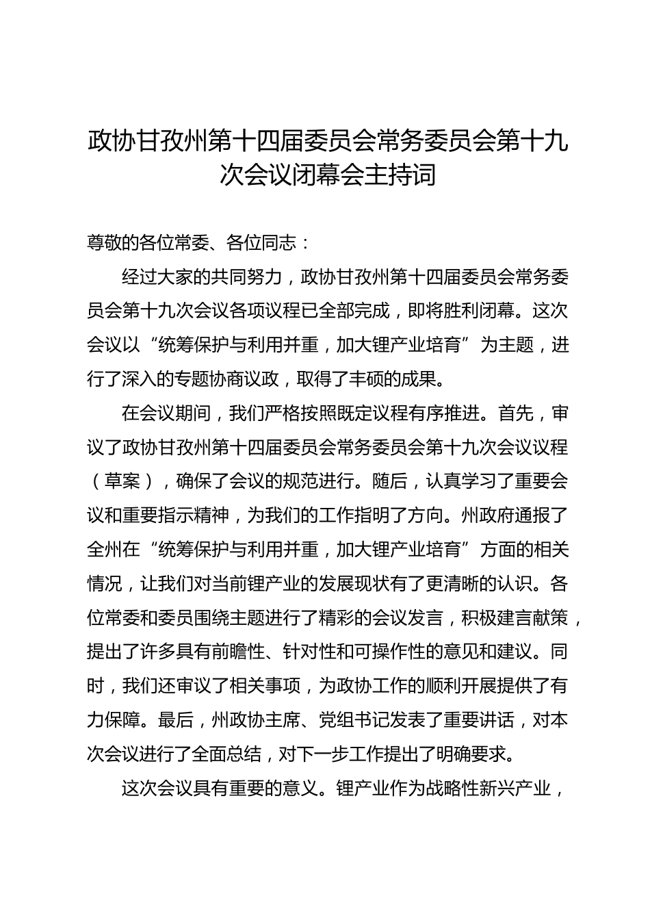 政協(xié)第十四屆委員會常務委員會第十九次會議閉幕會主持詞