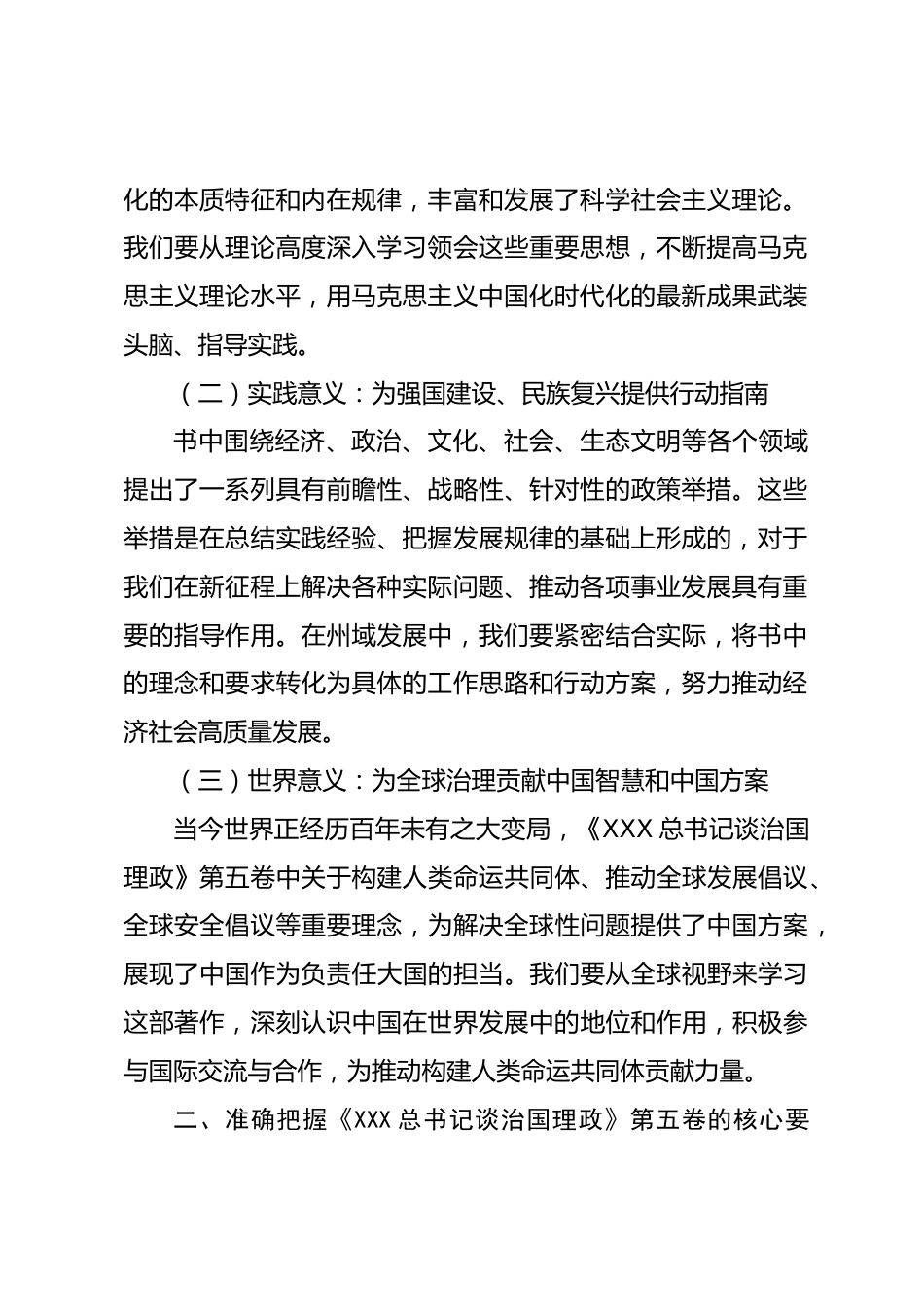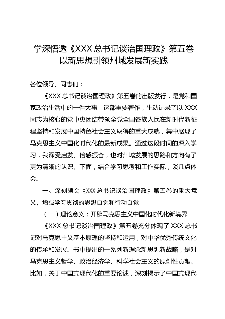 學深悟透《XXX總書記談治國理政》第五卷以新思想引領州域發(fā)展新實踐各位領導、同志們:《XXX總書記談治國理政》第五卷的出版發(fā)行,是黨和國家政治生活中的一件大事。這部重要著作,生動記錄了以XXX同志為核心的黨中央團結帶領全黨全國各族人民在新時代新征程堅持和發(fā)展中國特色社會主義取得的重大成就,集中展現了馬克思主義中國化時代化的最新成果。通過這段時間的深入學習,我深受啟發(fā)、倍感振奮,也對州域發(fā)展的思路和方向有了更為清晰的認識。下面,結合學習思考和工作實際,談幾點體會。一、深刻領會《XXX總書記談治國理政》第五卷的重大意義,增強學習貫徹的思想自...