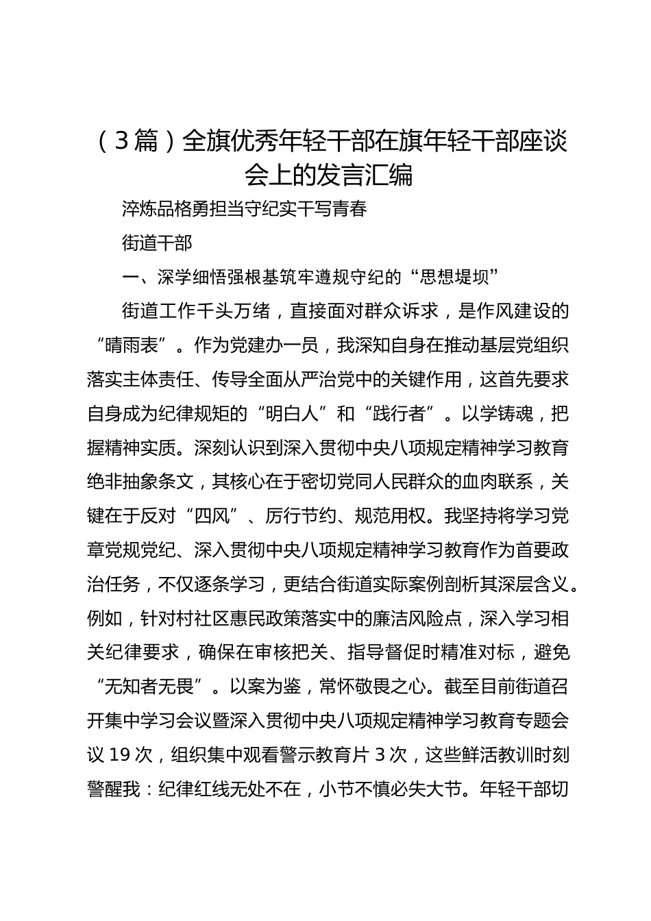 (3篇)全旗優(yōu)秀年輕干部在旗年輕干部座談會上的發(fā)言匯編淬煉品格勇?lián)?dāng)守紀(jì)實(shí)干寫青春街道干部一、深學(xué)細(xì)悟強(qiáng)根基筑牢遵規(guī)守紀(jì)的“思想堤壩”街道工作千頭萬緒,直接面對群眾訴求,是作風(fēng)建設(shè)的“晴雨表”。作為黨建辦一員,我深知自身在推動基層黨組織落實(shí)主體責(zé)任、傳導(dǎo)全面從嚴(yán)治黨中的關(guān)鍵作用,這首先要求自身成為紀(jì)律規(guī)矩的“明白人”和“踐行者”。以學(xué)鑄魂,把握精神實(shí)質(zhì)。深刻認(rèn)識到深入貫徹中央八項規(guī)定精神學(xué)習(xí)教育絕非抽象條文,其核心在于密切黨同人民群眾的血肉聯(lián)系,關(guān)鍵在于反對“四風(fēng)”、厲行節(jié)約、規(guī)范用權(quán)。我堅持將學(xué)習(xí)黨章黨規(guī)黨紀(jì)、深入貫徹中央...