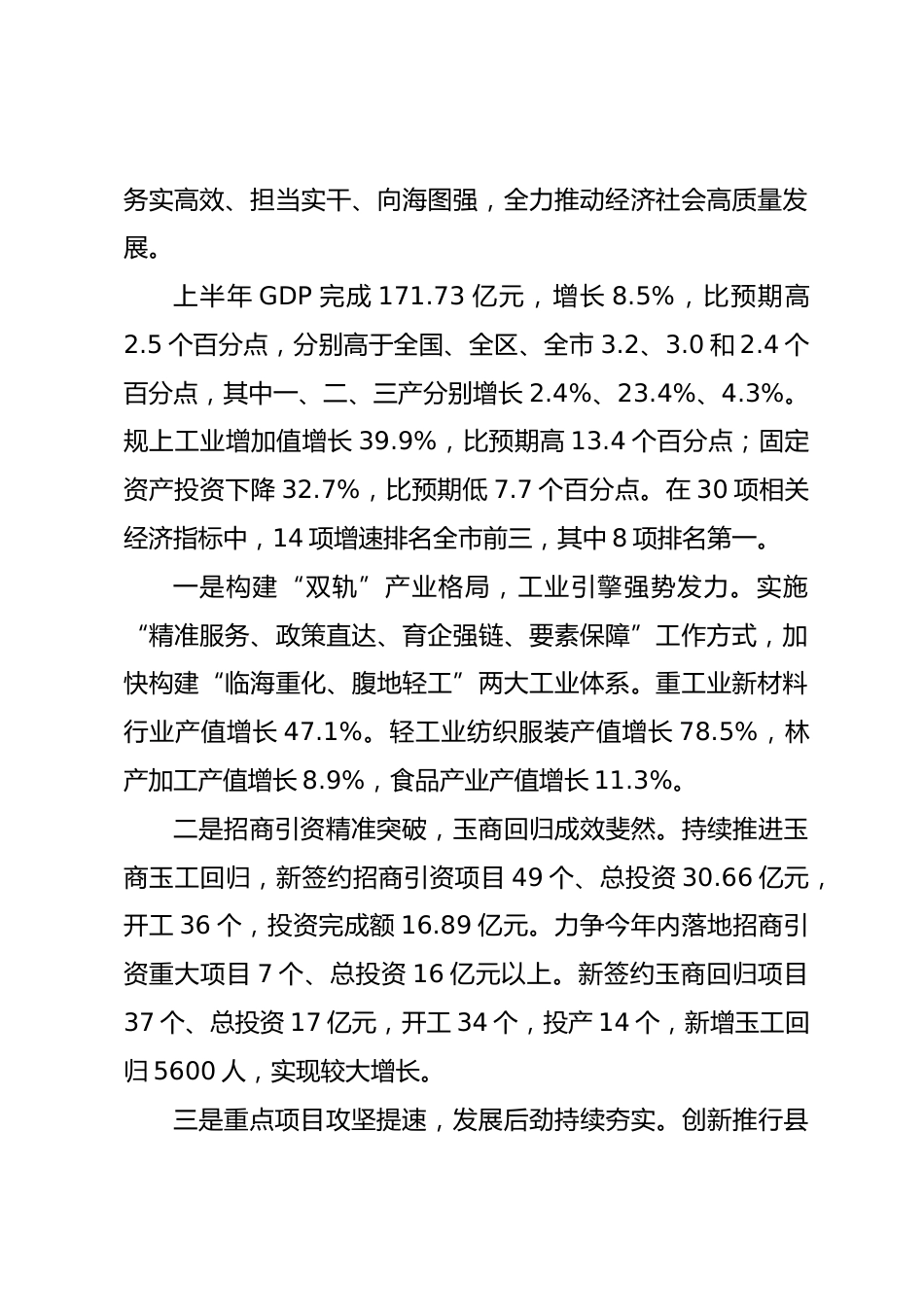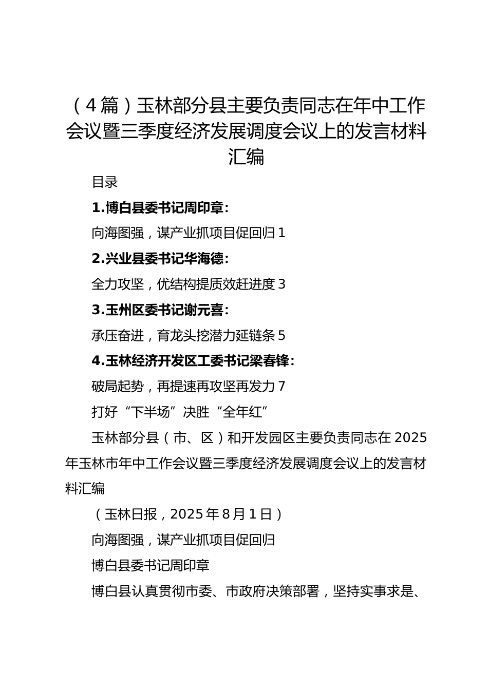 (4篇)玉林部分縣主要負責同志在年中工作會議暨三季度經(jīng)濟發(fā)展調度會議上的發(fā)言材料匯編目錄1.博白縣委書記周印章:向海圖強,謀產業(yè)抓項目促回歸12.興業(yè)縣委書記華海德:全力攻堅,優(yōu)結構提質效趕進度33.玉州區(qū)委書記謝元喜:承壓奮進,育龍頭挖潛力延鏈條54.玉林經(jīng)濟開發(fā)區(qū)工委書記梁春鋒:破局起勢,再提速再攻堅再發(fā)力7打好“下半場”決勝“全年紅”玉林部分縣(市、區(qū))和開發(fā)園區(qū)主要負責同志在2025年玉林市年中工作會議暨三季度經(jīng)濟發(fā)展調度會議上的發(fā)言材料匯編(玉林日報,2025年8月1日)向海圖強,謀產業(yè)抓項目促回歸博白縣委書記周印章博白縣認真貫徹市委、...