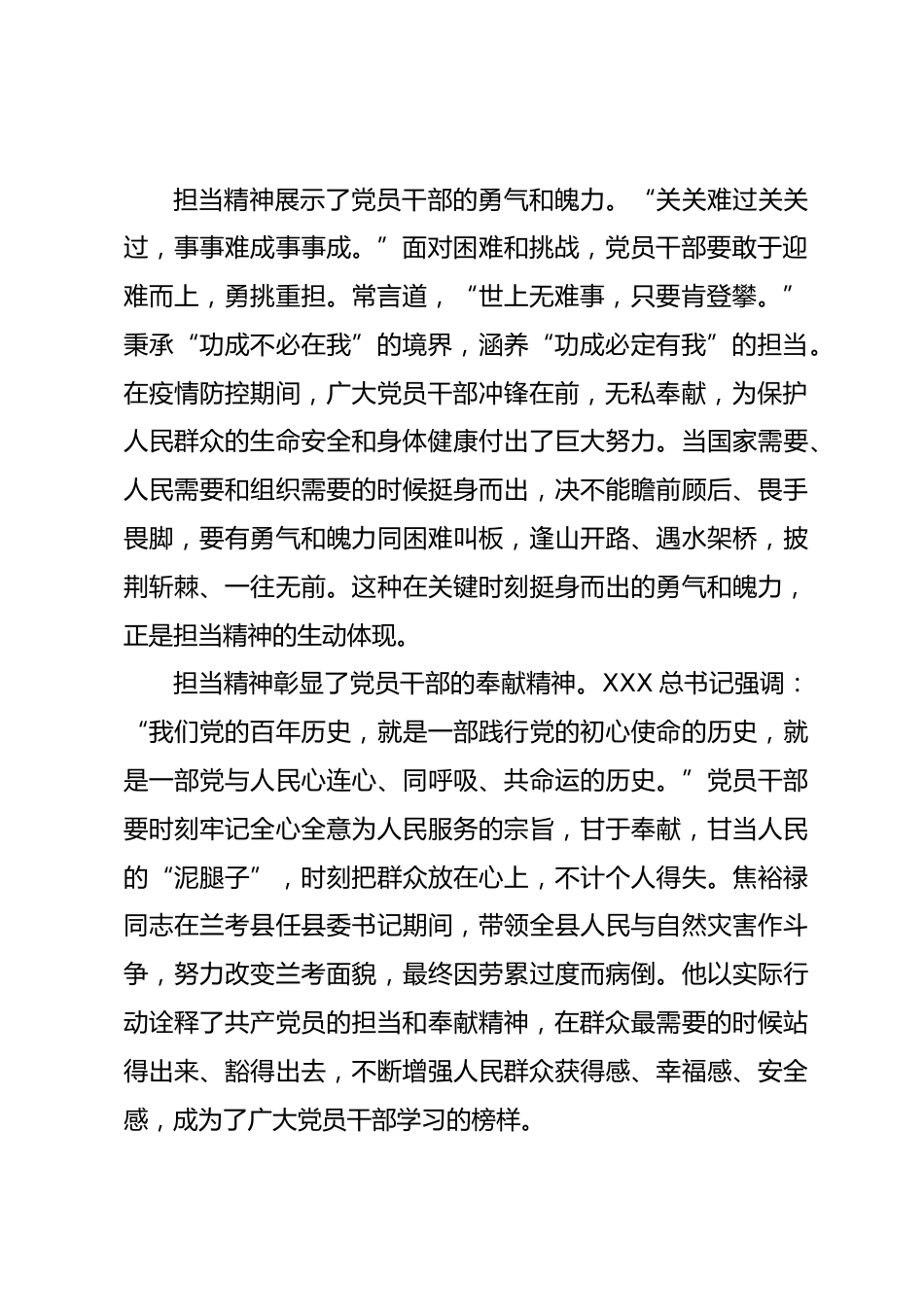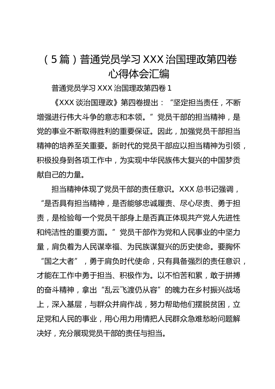 (5篇)普通黨員學(xué)習(xí)XXX治國(guó)理政第四卷心得體會(huì)匯編普通黨員學(xué)習(xí)XXX治國(guó)理政第四卷1《XXX談治國(guó)理政》第四卷提出:“堅(jiān)定擔(dān)當(dāng)責(zé)任,不斷增強(qiáng)進(jìn)行偉大斗爭(zhēng)的意志和本領(lǐng)?!秉h員干部的擔(dān)當(dāng)精神,是黨的事業(yè)不斷取得勝利的重要保證。因此,加強(qiáng)黨員干部擔(dān)當(dāng)精神的培養(yǎng)至關(guān)重要。新時(shí)代的黨員干部應(yīng)以擔(dān)當(dāng)精神為引領(lǐng),積極投身到各項(xiàng)工作中,為實(shí)現(xiàn)中華民族偉大復(fù)興的中國(guó)夢(mèng)貢獻(xiàn)自己的力量。擔(dān)當(dāng)精神體現(xiàn)了黨員干部的責(zé)任意識(shí)。XXX總書(shū)記強(qiáng)調(diào),“是否具有擔(dān)當(dāng)精神,是否能夠忠誠(chéng)履責(zé)、盡心盡責(zé)、勇于擔(dān)責(zé),是檢驗(yàn)每一個(gè)黨員干部身上是否真正體現(xiàn)共產(chǎn)黨人先進(jìn)性和純潔性的重要...