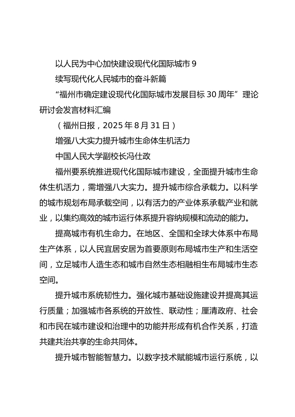 (8篇)“福州市確定建設(shè)現(xiàn)代化國際城市發(fā)展目標(biāo)30周年”理論研討會發(fā)言材料匯編目錄1.中國人民大學(xué)副校長馮仕政:增強(qiáng)八大實(shí)力提升城市生命體生機(jī)活力12.新華社研究院院長劉剛:為走出中國特色城市現(xiàn)代化新路子努力奮斗…33.中國社科院哲學(xué)研究所副所長、研究員周丹:推動聚焦高質(zhì)量主題的內(nèi)涵式發(fā)展建設(shè)現(xiàn)代化人民城市44.福建師范大學(xué)黨委書記潘玉騰:以文化強(qiáng)市賦能現(xiàn)代化國際城市建設(shè)的探索實(shí)踐…55.福建農(nóng)林大學(xué)黨委書記賴海榕:現(xiàn)代化國際城市是中國式現(xiàn)代化理論在地方的早期探索66.中央馬克思主義理論研究和建設(shè)工程首席專家、福建省XXX新時代中國特色社會主義思...