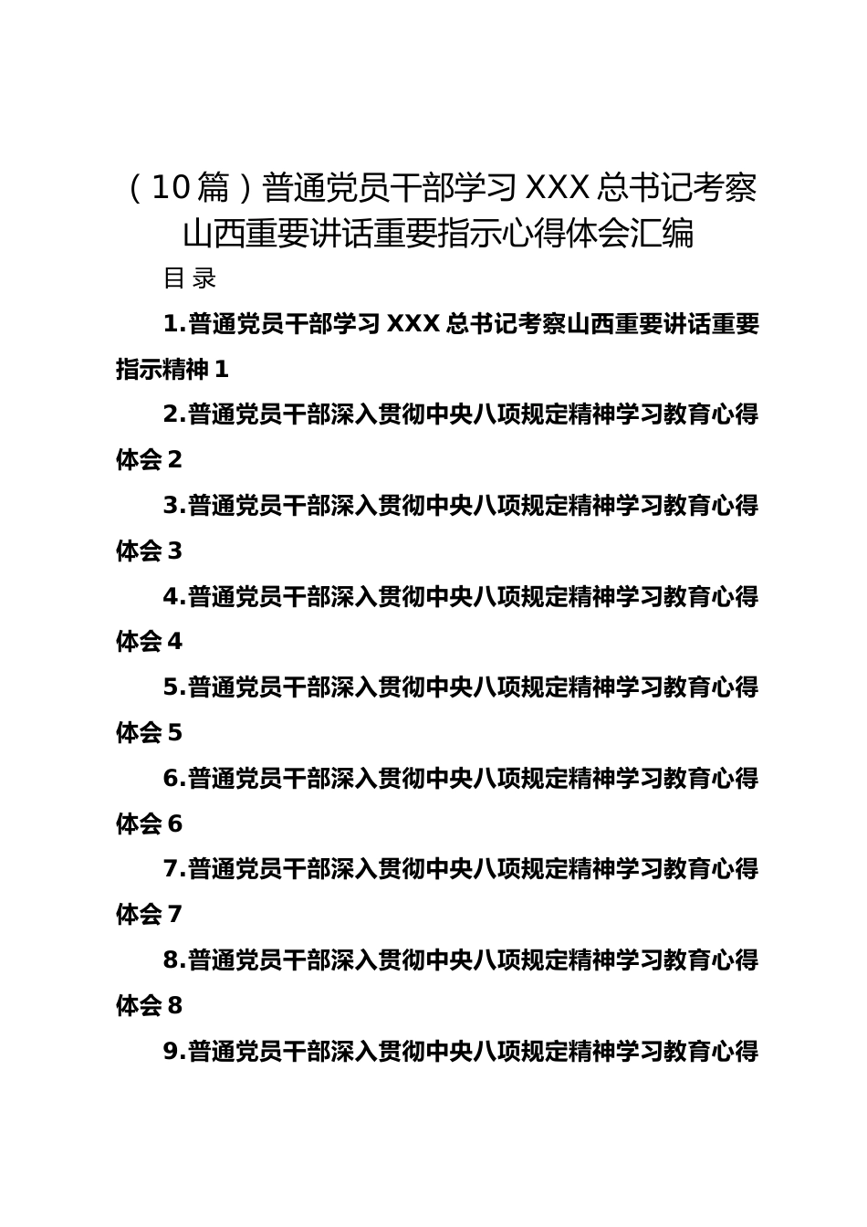 (10篇)普通黨員干部學(xué)習(xí)XXX總書(shū)記考察山西重要講話重要指示心得體會(huì)匯編目錄1.普通黨員干部學(xué)習(xí)XXX總書(shū)記考察山西重要講話重要指示精神12.普通黨員干部深入貫徹中央八項(xiàng)規(guī)定精神學(xué)習(xí)教育心得體會(huì)23.普通黨員干部深入貫徹中央八項(xiàng)規(guī)定精神學(xué)習(xí)教育心得體會(huì)34.普通黨員干部深入貫徹中央八項(xiàng)規(guī)定精神學(xué)習(xí)教育心得體會(huì)45.普通黨員干部深入貫徹中央八項(xiàng)規(guī)定精神學(xué)習(xí)教育心得體會(huì)56.普通黨員干部深入貫徹中央八項(xiàng)規(guī)定精神學(xué)習(xí)教育心得體會(huì)67.普通黨員干部深入貫徹中央八項(xiàng)規(guī)定精神學(xué)習(xí)教育心得體會(huì)78.普通黨員干部深入貫徹中央八項(xiàng)規(guī)定精神學(xué)習(xí)教育心得體會(huì)89.普通黨員干部深...