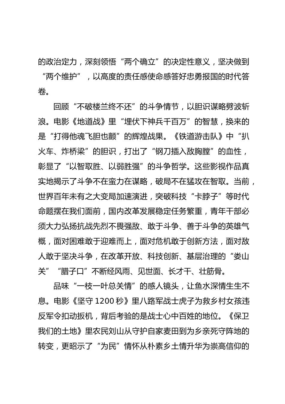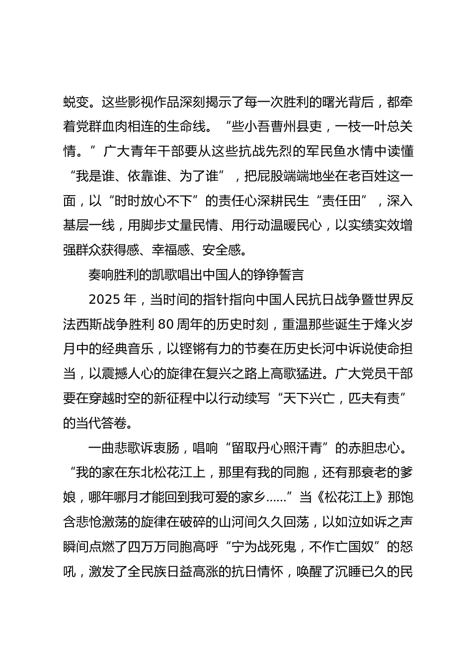 (26篇)賡續(xù)偉大抗戰(zhàn)精神文稿合集(心得發(fā)言參考)重溫銀幕上的抗戰(zhàn)故事激蕩萬丈青春豪情2025年是中國人民抗日戰(zhàn)爭暨世界反法西斯戰(zhàn)爭勝利80周年?;赝嵌窝c火交織的歷史,一大批誕生于硝煙中的文藝作品被搬上銀幕,以超越時(shí)空的精神力量留存于我們心間。那些經(jīng)典的鏡頭與畫面,不僅是苦難輝煌的藝術(shù)見證,更是新時(shí)代青年干部汲取精神養(yǎng)分的沃土。讓我們一起重溫抗戰(zhàn)影視作品,涵養(yǎng)忠誠的品格、斗爭的精神、為民的初心,讓偉大抗戰(zhàn)精神在新時(shí)代書寫更加絢爛的華章。重溫“豈因禍福避趨之”的生死瞬間,把許黨報(bào)國刻進(jìn)基因。電影《南京照相館》中郵差阿昌最后一幕赴死...