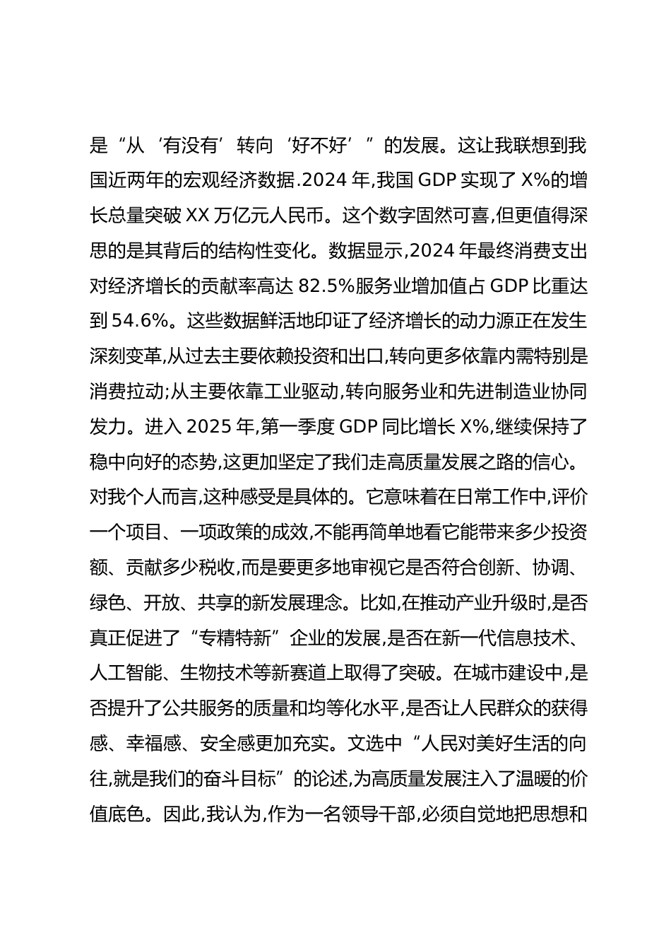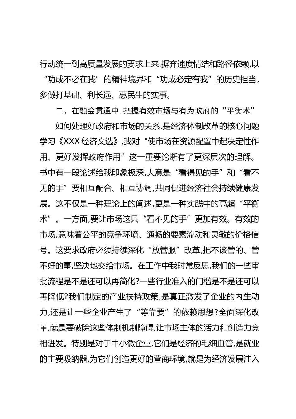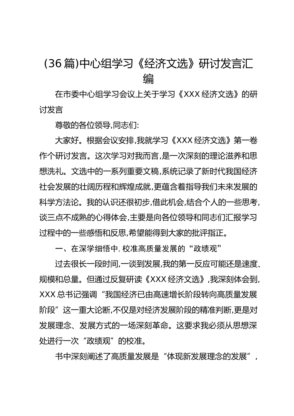 (36篇)中心組學(xué)習(xí)《經(jīng)濟(jì)文選》研討發(fā)言匯編在市委中心組學(xué)習(xí)會議上關(guān)于學(xué)習(xí)《XXX經(jīng)濟(jì)文選》的研討發(fā)言尊敬的各位領(lǐng)導(dǎo),同志們:大家好。根據(jù)會議安排,我就學(xué)習(xí)《XXX經(jīng)濟(jì)文選》第一卷作個研討發(fā)言。這次學(xué)習(xí)對我而言,是一次深刻的理論滋養(yǎng)和思想洗禮。文選中的一系列重要文稿,系統(tǒng)記錄了新時代我國經(jīng)濟(jì)社會發(fā)展的壯闊歷程和輝煌成就,更蘊(yùn)含著指導(dǎo)我們未來發(fā)展的科學(xué)方法論。我的認(rèn)識還很初步,借此機(jī)會,結(jié)合個人的一些思考,談三點不成熟的心得體會,主要是向各位領(lǐng)導(dǎo)和同志們匯報學(xué)習(xí)過程中的一些感悟和反思,希望能得到大家的批評指正。一、在深學(xué)細(xì)悟中,校準(zhǔn)高質(zhì)量發(fā)展的“政...
