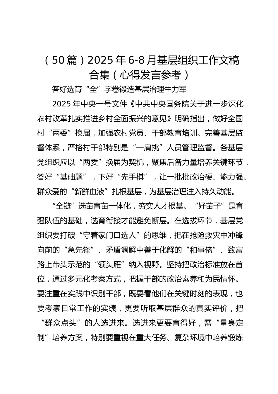(50篇)2025年6-8月基層組織工作文稿合集(心得發(fā)言參考)