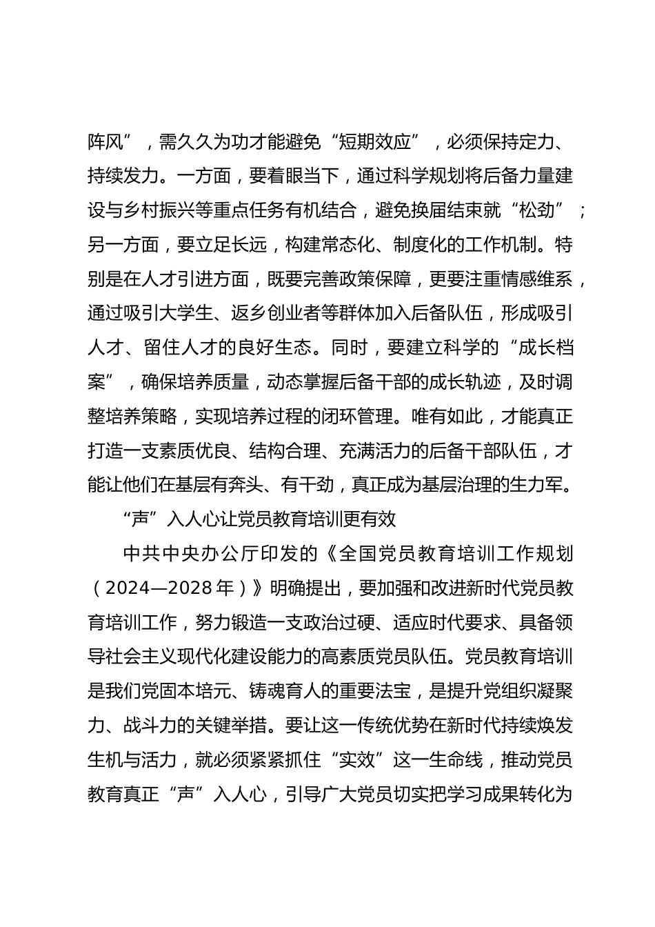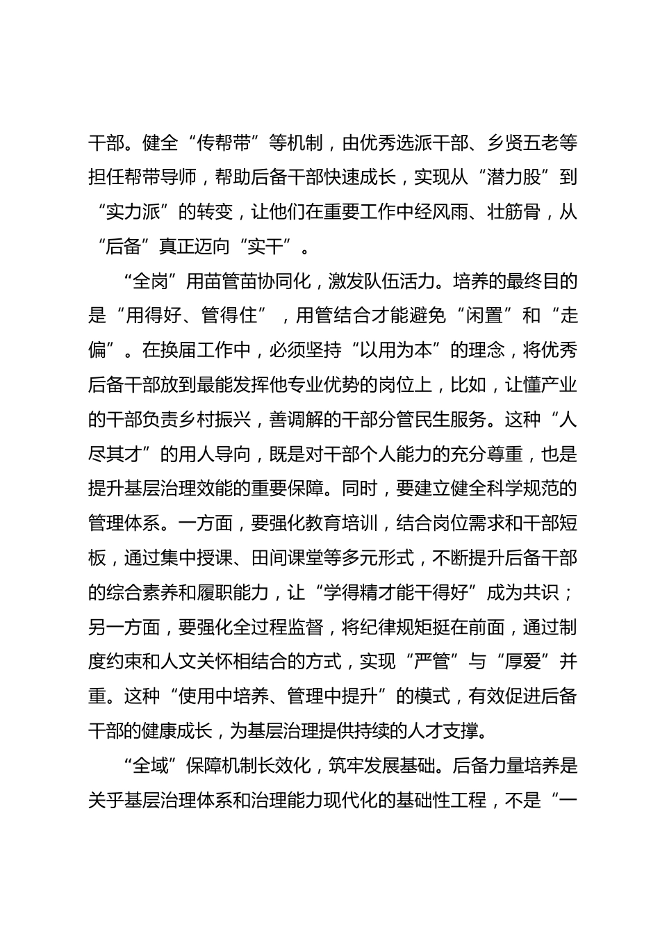 (50篇)2025年6-8月基層組織工作文稿合集(心得發(fā)言參考)答好選育“全”字卷鍛造基層治理生力軍2025年中央一號文件《中共中央國務(wù)院關(guān)于進一步深化農(nóng)村改革扎實推進鄉(xiāng)村全面振興的意見》明確指出,做好全國村“兩委”換屆,加強農(nóng)村黨員、干部教育培訓(xùn)。完善基層監(jiān)督體系,嚴(yán)格村干部特別是“一肩挑”人員管理監(jiān)督。各基層黨組織應(yīng)以“兩委”換屆為契機,聚焦后備力量培養(yǎng)關(guān)鍵環(huán)節(jié),答好“基礎(chǔ)題”,下好“先手棋”,讓一批批政治硬、能力強、群眾愛的“新鮮血液”扎根基層,為基層治理注入持久動能?!叭湣边x苗育苗一體化,夯實人才根基?!昂妹缱印笔怯龔婈犖榈幕?..