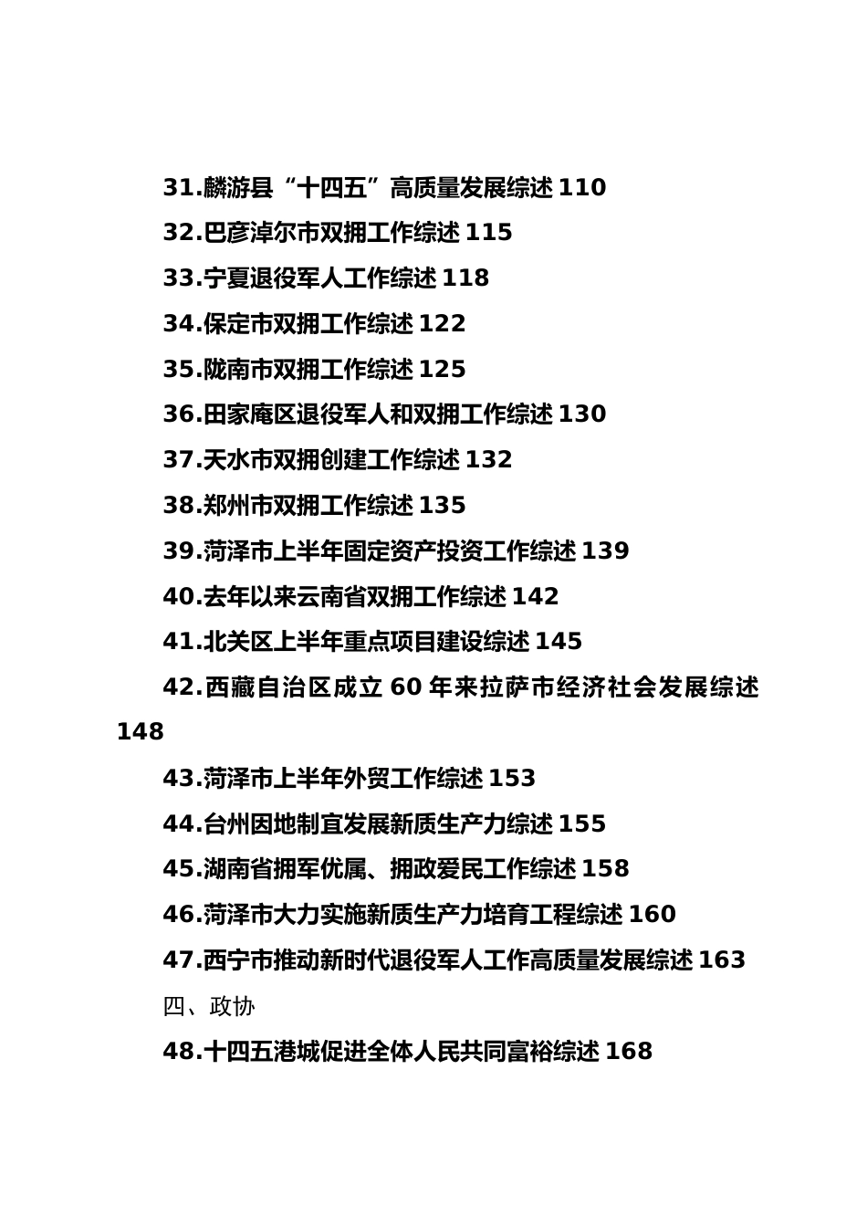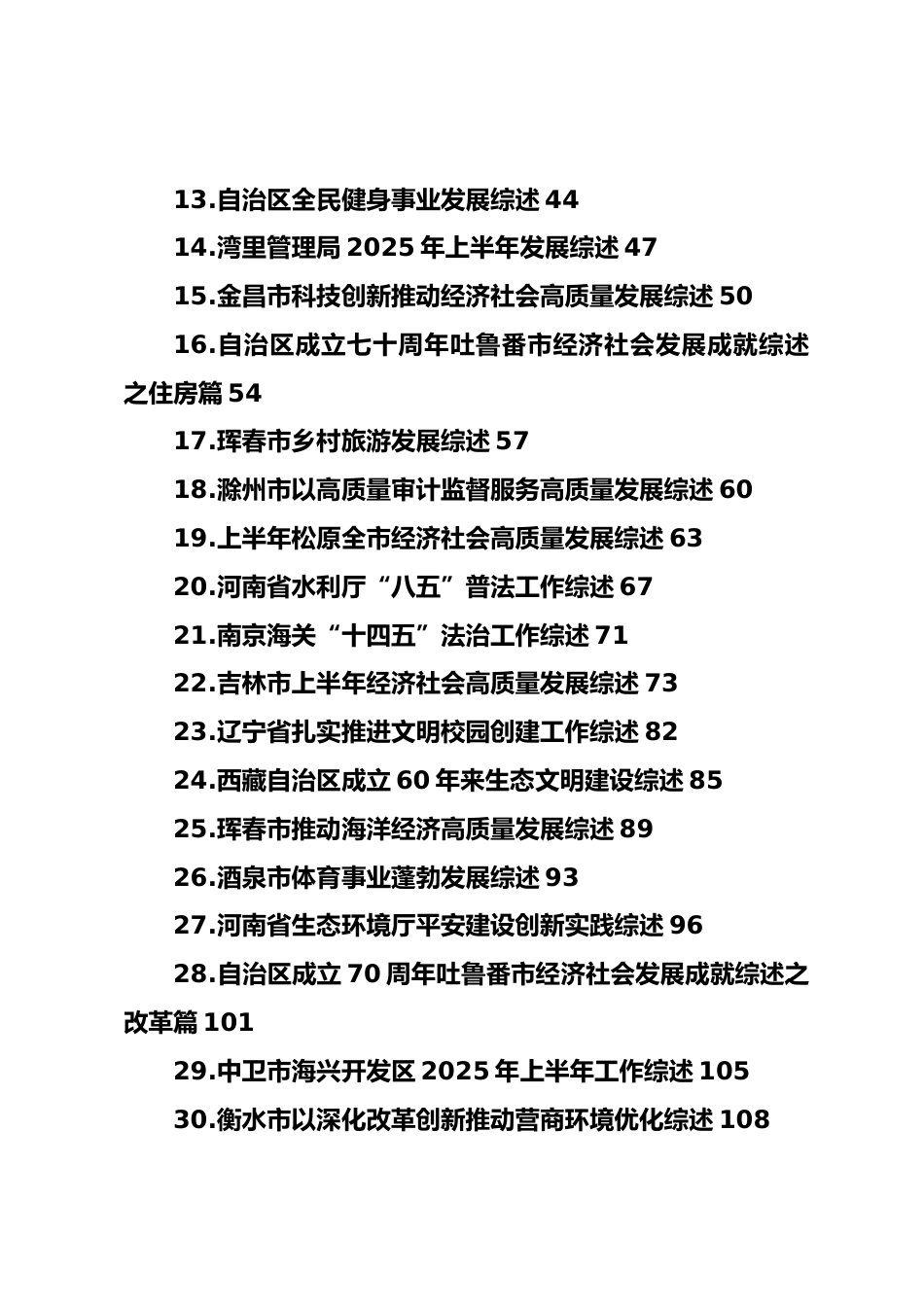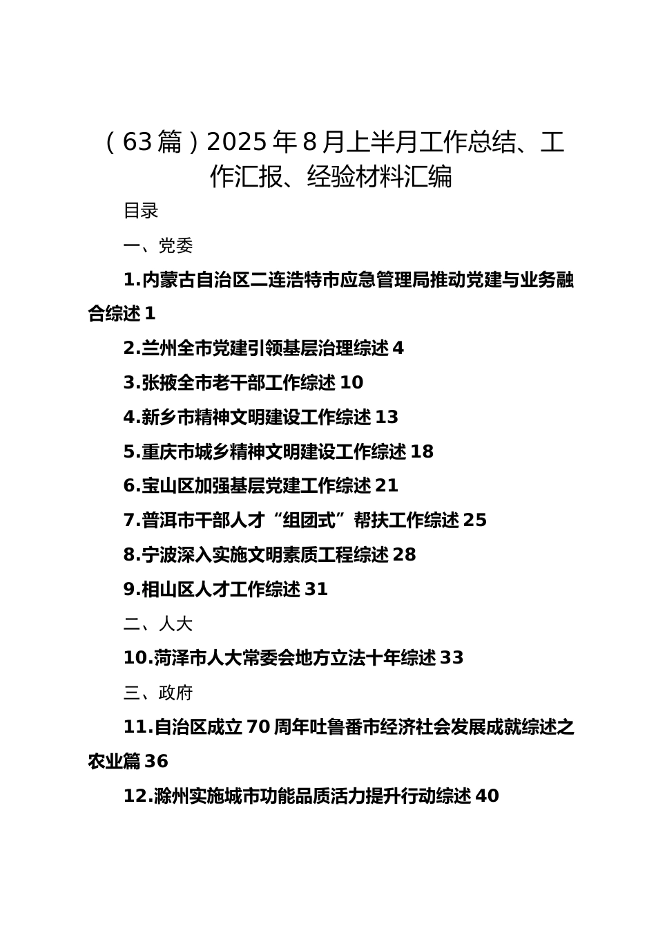 (63篇)2025年8月上半月工作總結(jié)、工作匯報(bào)、經(jīng)驗(yàn)材料匯編目錄一、黨委1.內(nèi)蒙古自治區(qū)二連浩特市應(yīng)急管理局推動黨建與業(yè)務(wù)融合綜述12.蘭州全市黨建引領(lǐng)基層治理綜述43.張掖全市老干部工作綜述104.新鄉(xiāng)市精神文明建設(shè)工作綜述135.重慶市城鄉(xiāng)精神文明建設(shè)工作綜述186.寶山區(qū)加強(qiáng)基層黨建工作綜述217.普洱市干部人才“組團(tuán)式”幫扶工作綜述258.寧波深入實(shí)施文明素質(zhì)工程綜述289.相山區(qū)人才工作綜述31二、人大10.菏澤市人大常委會地方立法十年綜述33三、政府11.自治區(qū)成立70周年吐魯番市經(jīng)濟(jì)社會發(fā)展成就綜述之農(nóng)業(yè)篇3612.滁州實(shí)施城市功能品質(zhì)活力提升行動綜述4013.自治區(qū)...