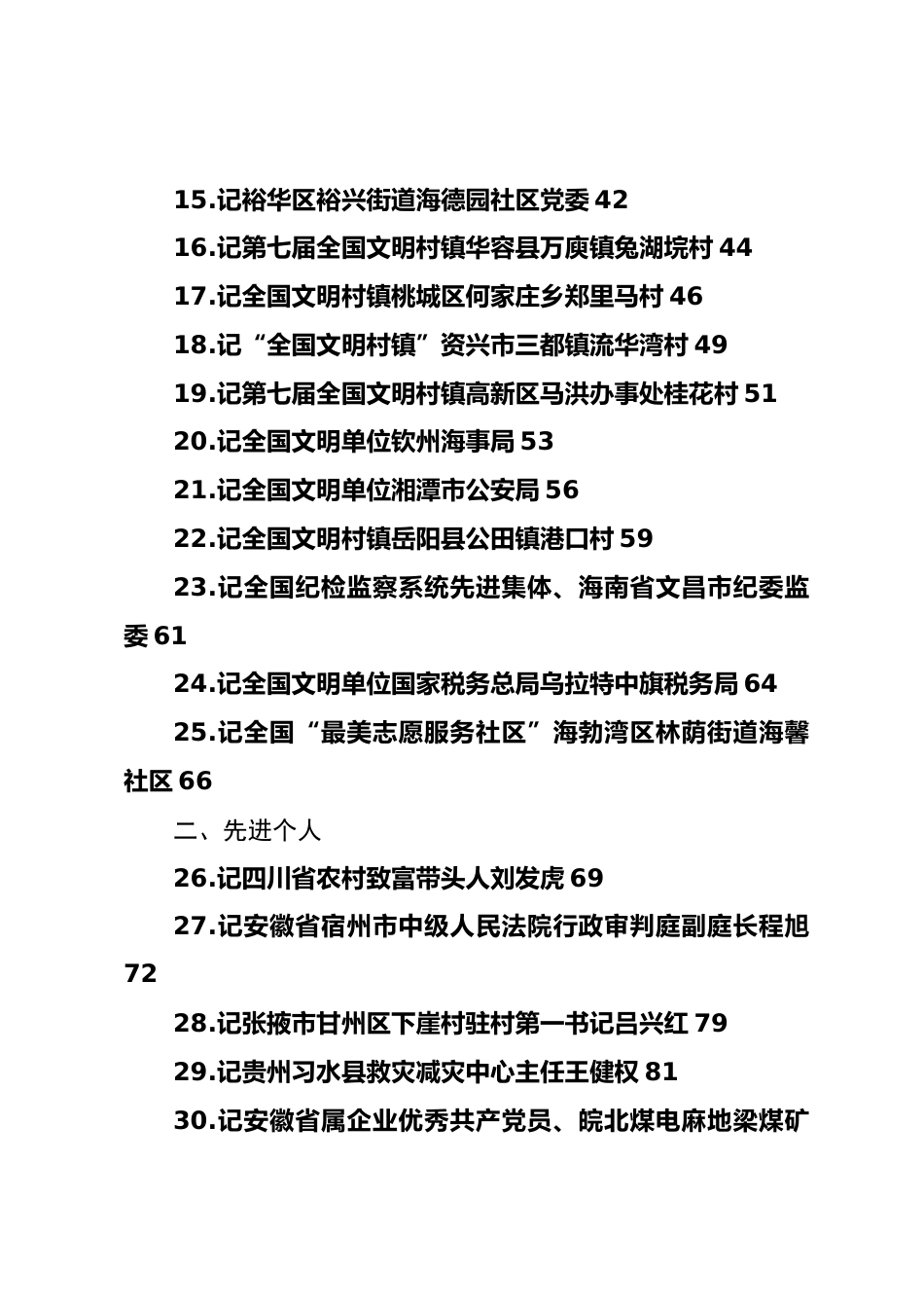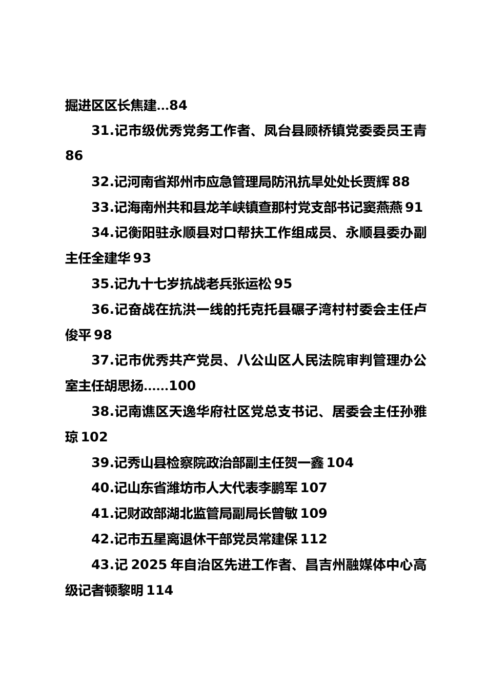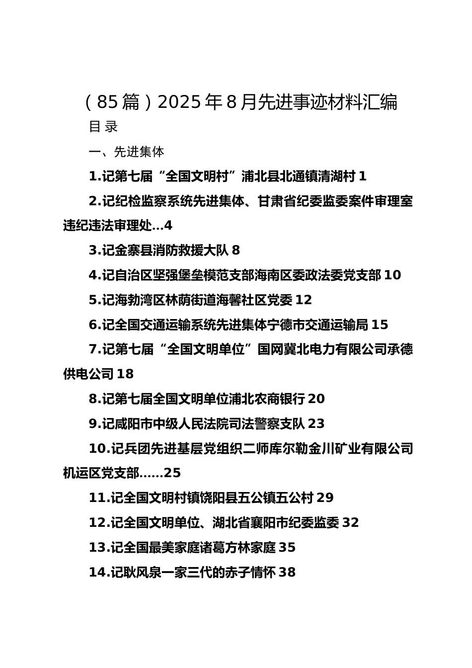 (85篇)2025年8月先進事跡材料匯編目錄一、先進集體1.記第七屆“全國文明村”浦北縣北通鎮(zhèn)清湖村12.記紀(jì)檢監(jiān)察系統(tǒng)先進集體、甘肅省紀(jì)委監(jiān)委案件審理室違紀(jì)違法審理處…43.記金寨縣消防救援大隊84.記自治區(qū)堅強堡壘模范支部海南區(qū)委政法委黨支部105.記海勃灣區(qū)林蔭街道海馨社區(qū)黨委126.記全國交通運輸系統(tǒng)先進集體寧德市交通運輸局157.記第七屆“全國文明單位”國網(wǎng)冀北電力有限公司承德供電公司188.記第七屆全國文明單位浦北農(nóng)商銀行209.記咸陽市中級人民法院司法警察支隊2310.記兵團先進基層黨組織二師庫爾勒金川礦業(yè)有限公司機運區(qū)黨支部……2511.記全國文明村鎮(zhèn)饒陽...