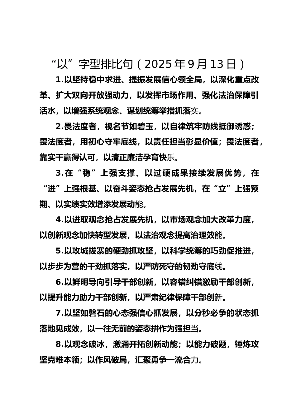 “以”字型排比句(2025年9月13日)1.以堅(jiān)持穩(wěn)中求進(jìn)、提振發(fā)展信心領(lǐng)全局,以深化重點(diǎn)改革、擴(kuò)大雙向開(kāi)放強(qiáng)動(dòng)力,以發(fā)揮市場(chǎng)作用、強(qiáng)化法治保障引活水,以增強(qiáng)系統(tǒng)觀念、謀劃統(tǒng)籌舉措抓落實(shí)。2.畏法度者,視名節(jié)如碧玉,以自律筑牢防線抵御誘惑;畏法度者,用初心守牢底線,以責(zé)任擔(dān)當(dāng)彰顯價(jià)值;畏法度者,靠實(shí)干贏得認(rèn)可,以清正廉潔孕育快樂(lè)。3.在“穩(wěn)”上強(qiáng)支撐、以過(guò)硬成果接續(xù)發(fā)展優(yōu)勢(shì),在“進(jìn)”上強(qiáng)根基、以?shī)^斗姿態(tài)搶占發(fā)展先機(jī),在“立”上強(qiáng)預(yù)期、以實(shí)績(jī)實(shí)效增添發(fā)展動(dòng)能。4.以進(jìn)取觀念搶占發(fā)展先機(jī),以市場(chǎng)觀念加大改革力度,以創(chuàng)新觀念加快轉(zhuǎn)型發(fā)展,以法治...