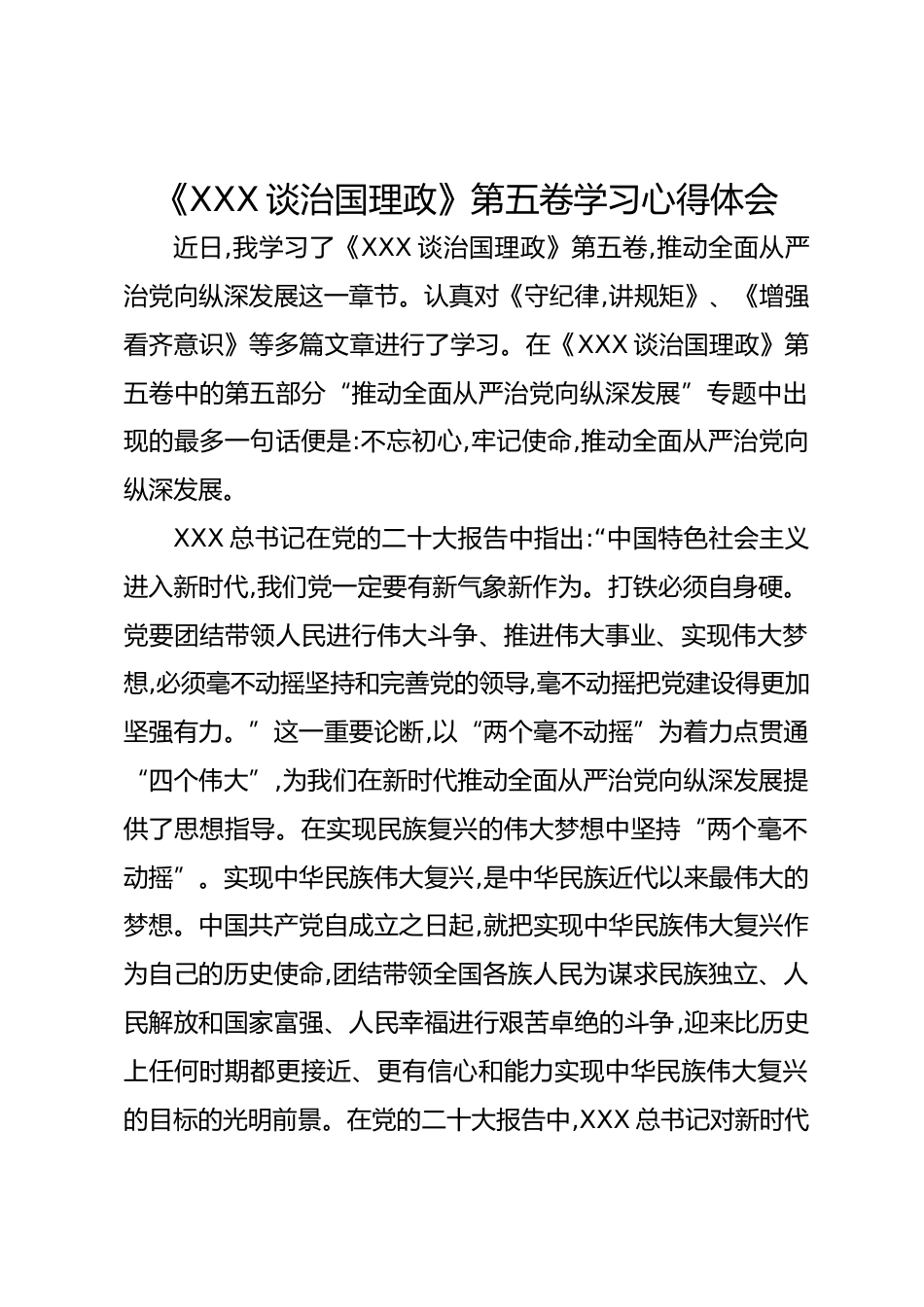 《XXX談治國理政》第五卷學(xué)習(xí)心得體會近日,我學(xué)習(xí)了《XXX談治國理政》第五卷,推動全面從嚴(yán)治黨向縱深發(fā)展這一章節(jié)。認(rèn)真對《守紀(jì)律,講規(guī)矩》、《增強(qiáng)看齊意識》等多篇文章進(jìn)行了學(xué)習(xí)。在《XXX談治國理政》第五卷中的第五部分“推動全面從嚴(yán)治黨向縱深發(fā)展”專題中出現(xiàn)的最多一句話便是:不忘初心,牢記使命,推動全面從嚴(yán)治黨向縱深發(fā)展。XXX總書記在黨的二十大報告中指出:“中國特色社會主義進(jìn)入新時代,我們黨一定要有新氣象新作為。打鐵必須自身硬。黨要團(tuán)結(jié)帶領(lǐng)人民進(jìn)行偉大斗爭、推進(jìn)偉大事業(yè)、實現(xiàn)偉大夢想,必須毫不動搖堅持和完善黨的領(lǐng)導(dǎo),毫不動搖把黨建設(shè)得更加堅強(qiáng)...