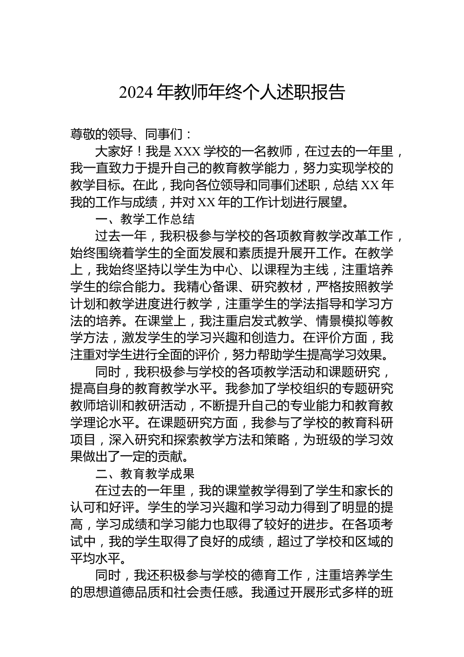 2024年教師年終個(gè)人述職報(bào)告尊敬的領(lǐng)導(dǎo)、同事們:大家好!我是XXX學(xué)校的一名教師,在過去的一年里,我一直致力于提升自己的教育教學(xué)能力,努力實(shí)現(xiàn)學(xué)校的教學(xué)目標(biāo)。在此,我向各位領(lǐng)導(dǎo)和同事們述職,總結(jié)XX年我的工作與成績,并對XX年的工作計(jì)劃進(jìn)行展望。一、教學(xué)工作總結(jié)過去一年,我積極參與學(xué)校的各項(xiàng)教育教學(xué)改革工作,始終圍繞著學(xué)生的全面發(fā)展和素質(zhì)提升展開工作。在教學(xué)上,我始終堅(jiān)持以學(xué)生為中心、以課程為主線,注重培養(yǎng)學(xué)生的綜合能力。我精心備課、研究教材,嚴(yán)格按照教學(xué)計(jì)劃和教學(xué)進(jìn)度進(jìn)行教學(xué),注重學(xué)生的學(xué)法指導(dǎo)和學(xué)習(xí)方法的培養(yǎng)。在課堂上,我注重啟...