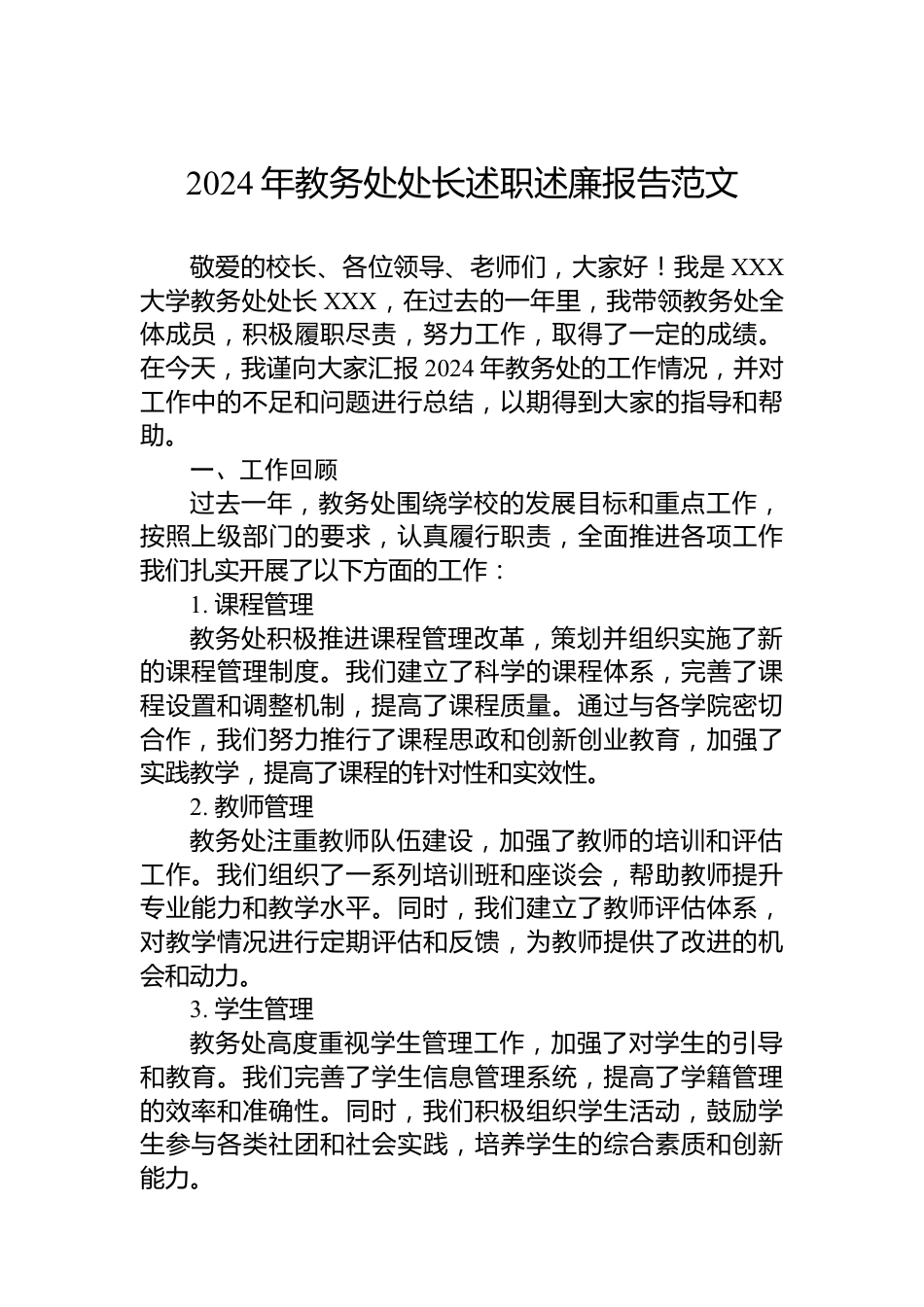 2024年教務處處長述職述廉報告范文敬愛的校長、各位領導、老師們,大家好!我是XXX大學教務處處長XXX,在過去的一年里,我?guī)ьI教務處全體成員,積極履職盡責,努力工作,取得了一定的成績。在今天,我謹向大家匯報2024年教務處的工作情況,并對工作中的不足和問題進行總結(jié),以期得到大家的指導和幫助。一、工作回顧過去一年,教務處圍繞學校的發(fā)展目標和重點工作,按照上級部門的要求,認真履行職責,全面推進各項工作我們扎實開展了以下方面的工作:1.課程管理教務處積極推進課程管理改革,策劃并組織實施了新的課程管理制度。我們建立了科學的課程體系,完善了課程設置...