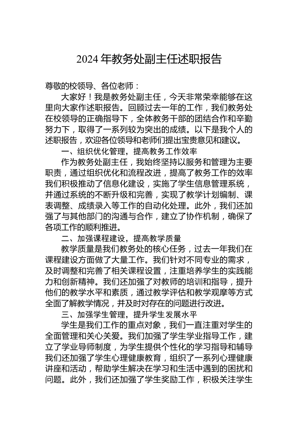 2024年教務(wù)處副主任述職報告尊敬的校領(lǐng)導(dǎo)、各位老師:大家好!我是教務(wù)處副主任,今天非常榮幸能夠在這里向大家作述職報告?;仡欉^去一年的工作,我們教務(wù)處在校領(lǐng)導(dǎo)的正確指導(dǎo)下,全體教務(wù)干部的團(tuán)結(jié)合作和辛勤努力下,取得了一系列較為突出的成績。以下是我個人的述職報告,歡迎各位領(lǐng)導(dǎo)和老師們提出寶貴意見和建議。一、組織優(yōu)化管理,提高教務(wù)工作效率作為教務(wù)處副主任,我始終堅(jiān)持以服務(wù)和管理為主要職責(zé),通過組織優(yōu)化和流程改進(jìn),提高了教務(wù)工作的效率我們積極推動了信息化建設(shè),實(shí)施了學(xué)生信息管理系統(tǒng),并通過系統(tǒng)的不斷升級和完善,實(shí)現(xiàn)了教學(xué)計(jì)劃編制、課表調(diào)...