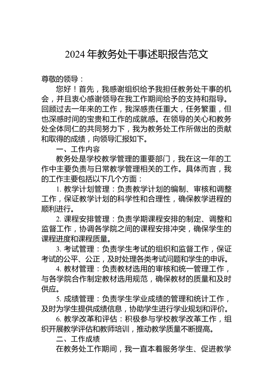 2024年教務(wù)處干事述職報告范文尊敬的領(lǐng)導(dǎo):您好!首先,我感謝組織給予我擔(dān)任教務(wù)處干事的機(jī)會,并且衷心感謝領(lǐng)導(dǎo)在我工作期間給予的支持和指導(dǎo)?;仡欉^去一年來的工作,我深感責(zé)任重大,任務(wù)繁重,但也深感時間的寶貴和工作的成就感。在領(lǐng)導(dǎo)的關(guān)心和教務(wù)處全體同仁的共同努力下,我為教務(wù)處工作所做出的貢獻(xiàn)和取得的成績,向領(lǐng)導(dǎo)匯報如下。一、工作內(nèi)容教務(wù)處是學(xué)校教學(xué)管理的重要部門,我在這一年的工作中主要負(fù)責(zé)與日常教學(xué)管理相關(guān)的工作。具體而言,我的工作主要包括以下幾個方面:1.教學(xué)計(jì)劃管理:負(fù)責(zé)教學(xué)計(jì)劃的編制、審核和調(diào)整工作,保證教學(xué)計(jì)劃的科學(xué)性和合理...