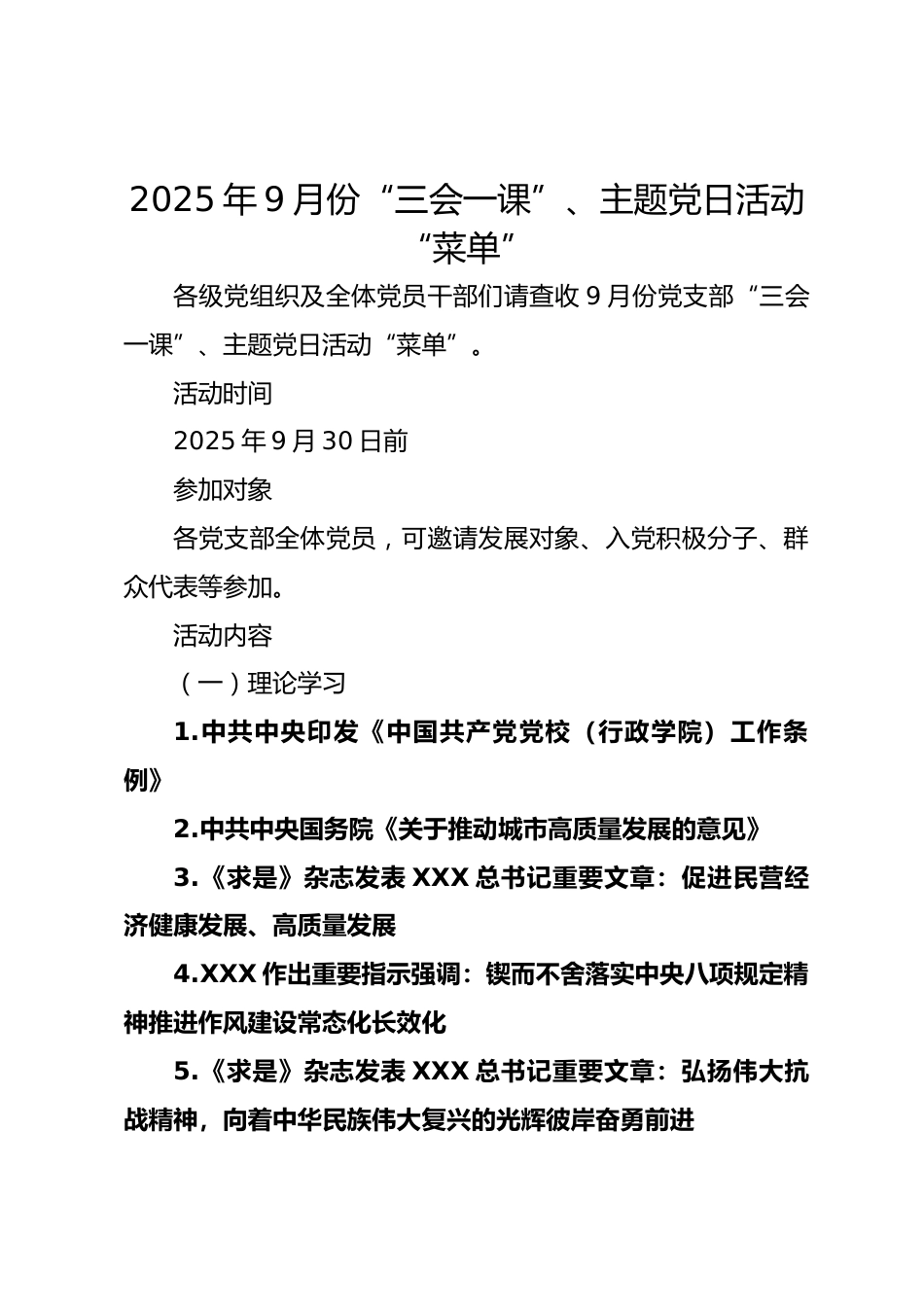 2025年9月份“三會一課”、主題黨日活動“菜單”