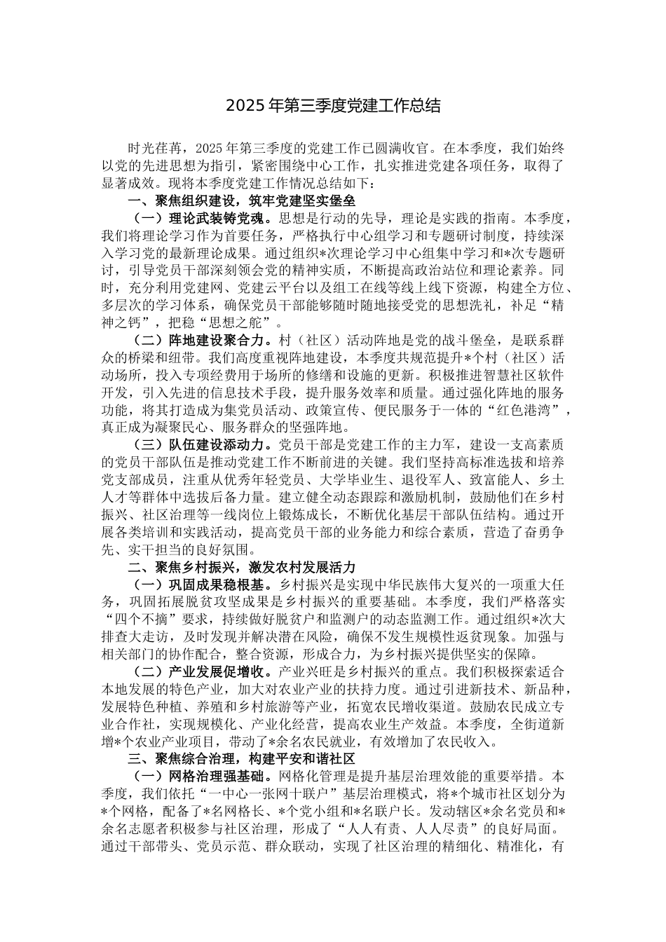 2025年第三季度黨建工作總結(jié)時(shí)光荏苒,2025年第三季度的黨建工作已圓滿收官。在本季度,我們始終以黨的先進(jìn)思想為指引,緊密圍繞中心工作,扎實(shí)推進(jìn)黨建各項(xiàng)任務(wù),取得了顯著成效?,F(xiàn)將本季度黨建工作情況總結(jié)如下:一、聚焦組織建設(shè),筑牢黨建堅(jiān)實(shí)堡壘(一)理論武裝鑄黨魂。思想是行動(dòng)的先導(dǎo),理論是實(shí)踐的指南。本季度,我們將理論學(xué)習(xí)作為首要任務(wù),嚴(yán)格執(zhí)行中心組學(xué)習(xí)和專題研討制度,持續(xù)深入學(xué)習(xí)黨的最新理論成果。通過組織*次理論學(xué)習(xí)中心組集中學(xué)習(xí)和*次專題研討,引導(dǎo)黨員干部深刻領(lǐng)會(huì)黨的精神實(shí)質(zhì),不斷提高政治站位和理論素養(yǎng)。同時(shí),充分利用黨建網(wǎng)、黨建云...