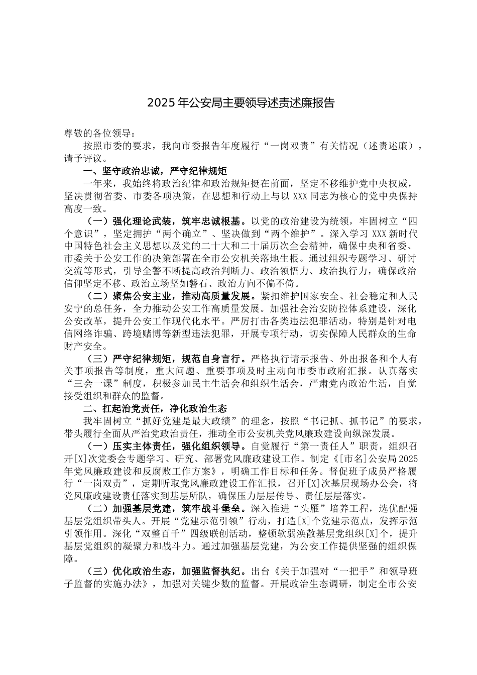 2025年公安局主要領導述責述廉報告尊敬的各位領導:按照市委的要求,我向市委報告年度履行“一崗雙責”有關情況(述責述廉),請予評議。一、堅守政治忠誠,嚴守紀律規(guī)矩一年來,我始終將政治紀律和政治規(guī)矩挺在前面,堅定不移維護黨中央權威,堅決貫徹省委、市委各項決策,在思想和行動上與以XXX同志為核心的黨中央保持高度一致。(一)強化理論武裝,筑牢忠誠根基。以黨的政治建設為統(tǒng)領,牢固樹立“四個意識”,堅定擁護“兩個確立”、堅決做到“兩個維護”。深入學習XXX新時代中國特色社會主義思想以及黨的二十大和二十屆歷次全會精神,確保中央和省委、市委關于公安...