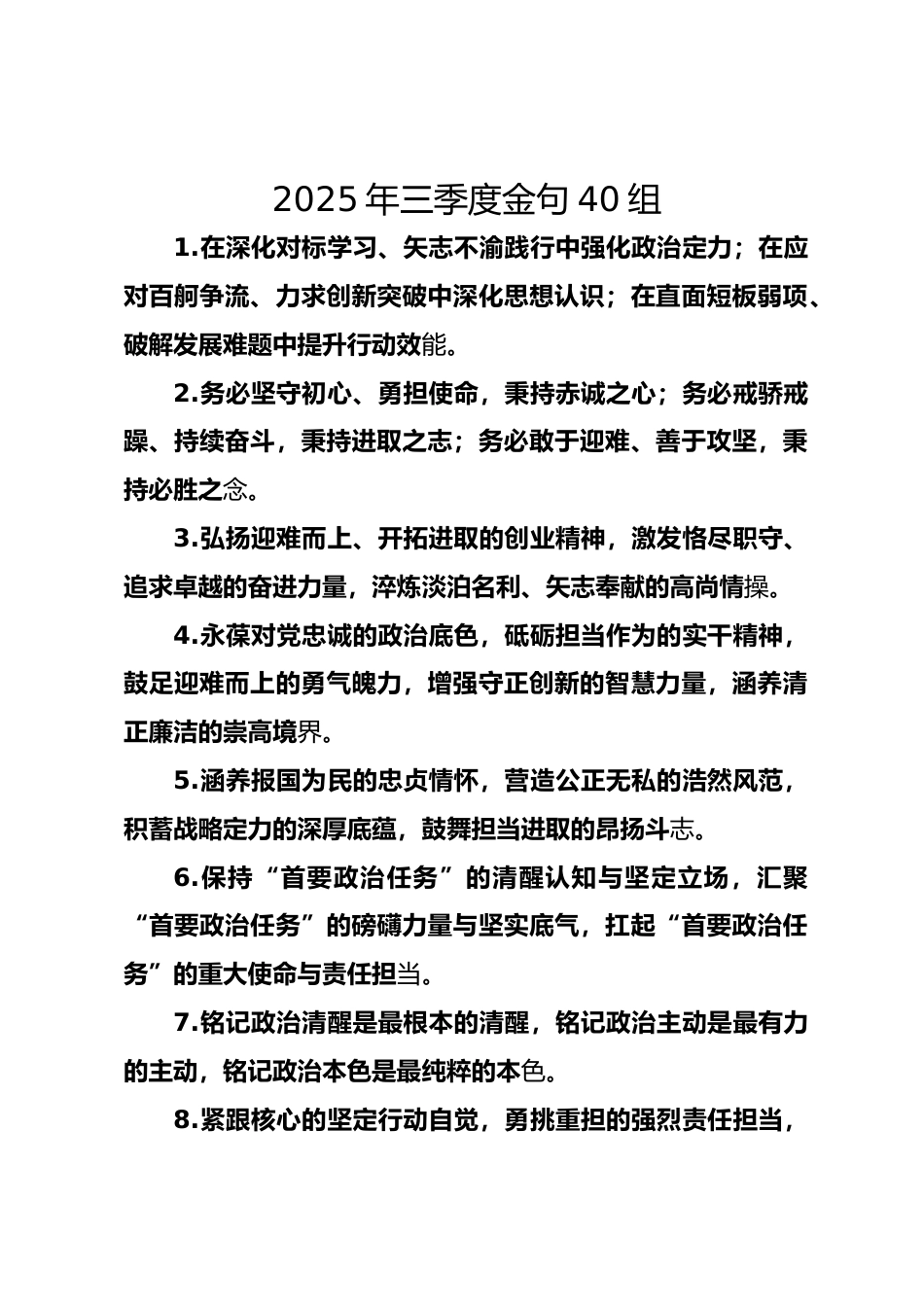 2025年三季度金句40組1.在深化對(duì)標(biāo)學(xué)習(xí)、矢志不渝踐行中強(qiáng)化政治定力;在應(yīng)對(duì)百舸爭流、力求創(chuàng)新突破中深化思想認(rèn)識(shí);在直面短板弱項(xiàng)、破解發(fā)展難題中提升行動(dòng)效能。2.務(wù)必堅(jiān)守初心、勇?lián)姑殖嗾\之心;務(wù)必戒驕戒躁、持續(xù)奮斗,秉持進(jìn)取之志;務(wù)必敢于迎難、善于攻堅(jiān),秉持必勝之念。3.弘揚(yáng)迎難而上、開拓進(jìn)取的創(chuàng)業(yè)精神,激發(fā)恪盡職守、追求卓越的奮進(jìn)力量,淬煉淡泊名利、矢志奉獻(xiàn)的高尚情操。4.永葆對(duì)黨忠誠的政治底色,砥礪擔(dān)當(dāng)作為的實(shí)干精神,鼓足迎難而上的勇氣魄力,增強(qiáng)守正創(chuàng)新的智慧力量,涵養(yǎng)清正廉潔的崇高境界。5.涵養(yǎng)報(bào)國為民的忠貞情懷,營造公正...