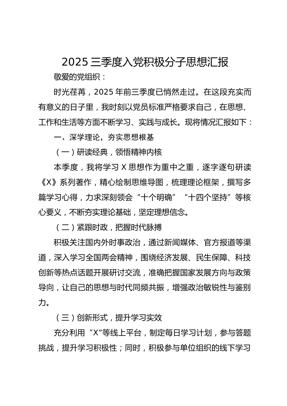 2025三季度入黨積極分子思想?yún)R報敬愛的黨組織:時光荏苒,2025年前三季度已悄然走過。在這段充實而有意義的日子里,我時刻以黨員標準嚴格要求自己,在思想、工作和生活等方面不斷學習、實踐與成長。現(xiàn)將情況匯報如下:一、深學理論,夯實思想根基(一)研讀經(jīng)典,領悟精神內(nèi)核本季度,我將學習X思想作為重中之重,逐字逐句研讀《X》系列著作,精心繪制思維導圖,梳理理論框架,撰寫多篇學習心得,力求深刻領會“十個明確”“十四個堅持”等核心要義,不斷夯實理論基礎,堅定理想信念。(二)緊跟時政,把握時代脈搏積極關(guān)注國內(nèi)外時事政治,通過新聞媒體、官方報道等渠道...