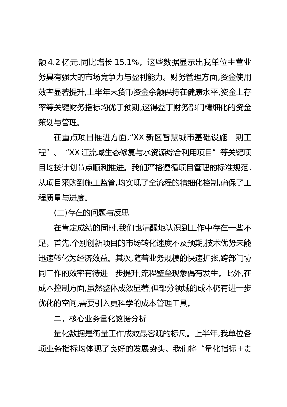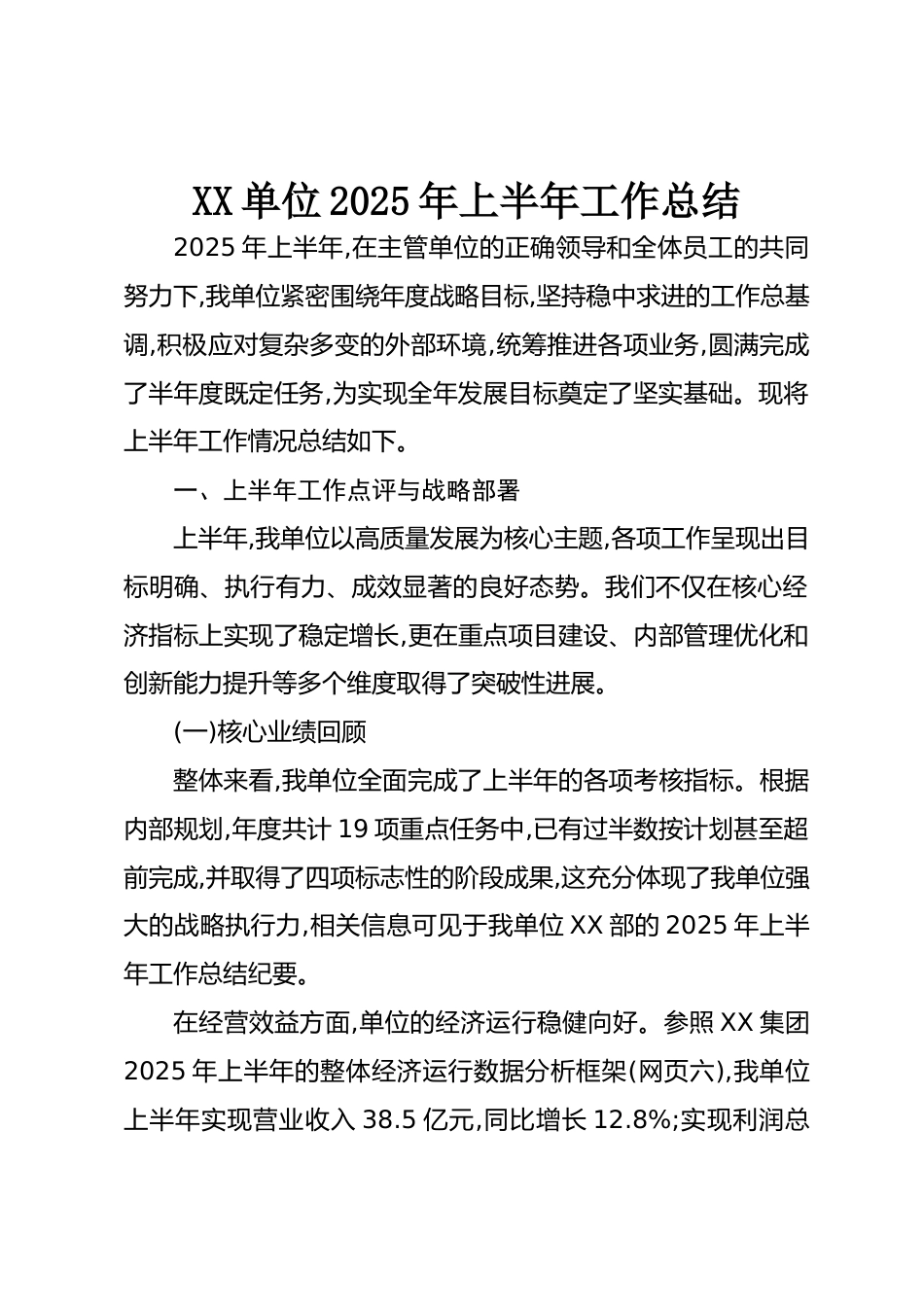 XX單位2025年上半年工作總結(jié)2025年上半年,在主管單位的正確領(lǐng)導(dǎo)和全體員工的共同努力下,我單位緊密圍繞年度戰(zhàn)略目標(biāo),堅(jiān)持穩(wěn)中求進(jìn)的工作總基調(diào),積極應(yīng)對(duì)復(fù)雜多變的外部環(huán)境,統(tǒng)籌推進(jìn)各項(xiàng)業(yè)務(wù),圓滿完成了半年度既定任務(wù),為實(shí)現(xiàn)全年發(fā)展目標(biāo)奠定了堅(jiān)實(shí)基礎(chǔ)?,F(xiàn)將上半年工作情況總結(jié)如下。一、上半年工作點(diǎn)評(píng)與戰(zhàn)略部署上半年,我單位以高質(zhì)量發(fā)展為核心主題,各項(xiàng)工作呈現(xiàn)出目標(biāo)明確、執(zhí)行有力、成效顯著的良好態(tài)勢(shì)。我們不僅在核心經(jīng)濟(jì)指標(biāo)上實(shí)現(xiàn)了穩(wěn)定增長(zhǎng),更在重點(diǎn)項(xiàng)目建設(shè)、內(nèi)部管理優(yōu)化和創(chuàng)新能力提升等多個(gè)維度取得了突破性進(jìn)展。(一)核心業(yè)績(jī)回顧整體來(lái)看,我單位全面...