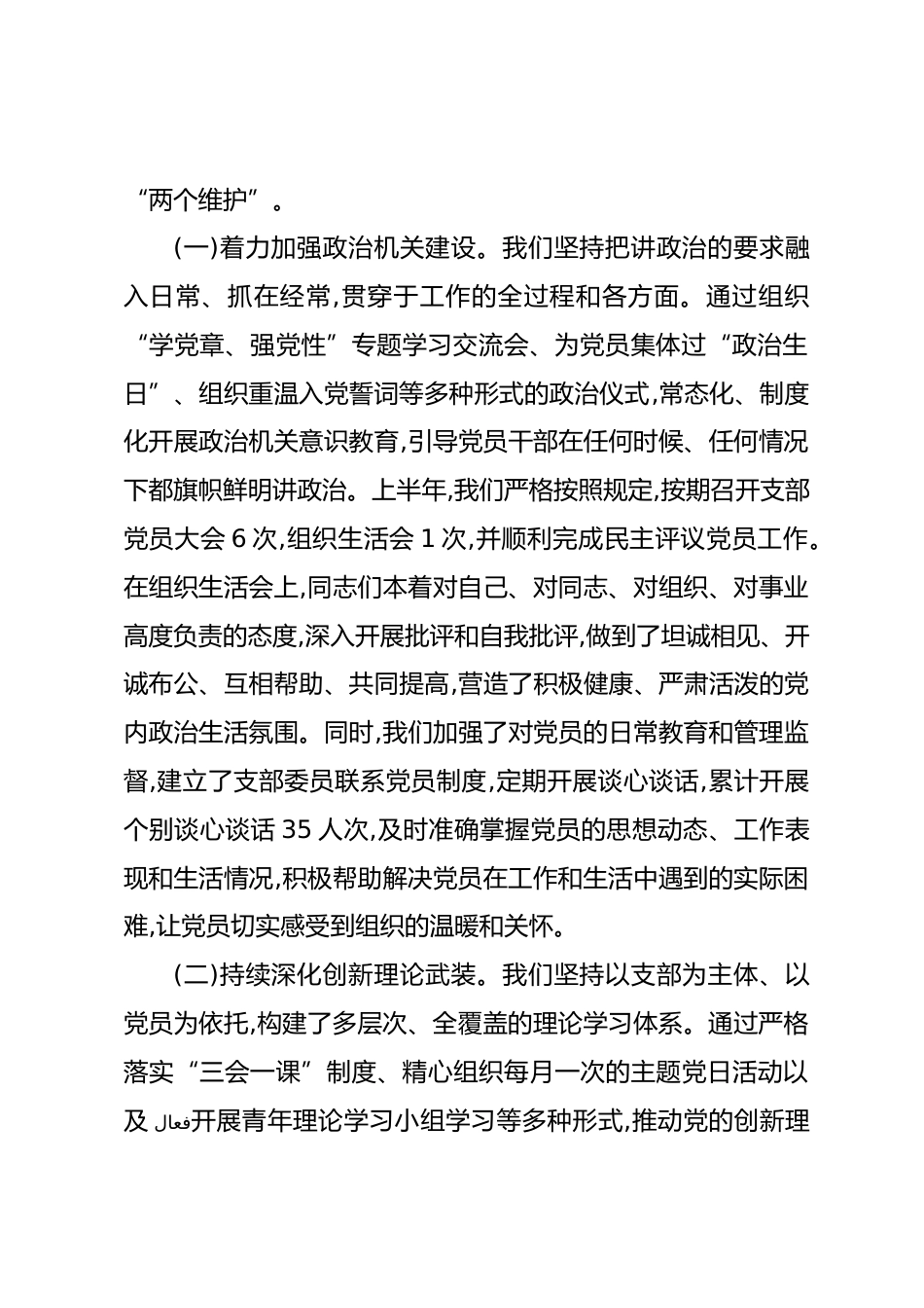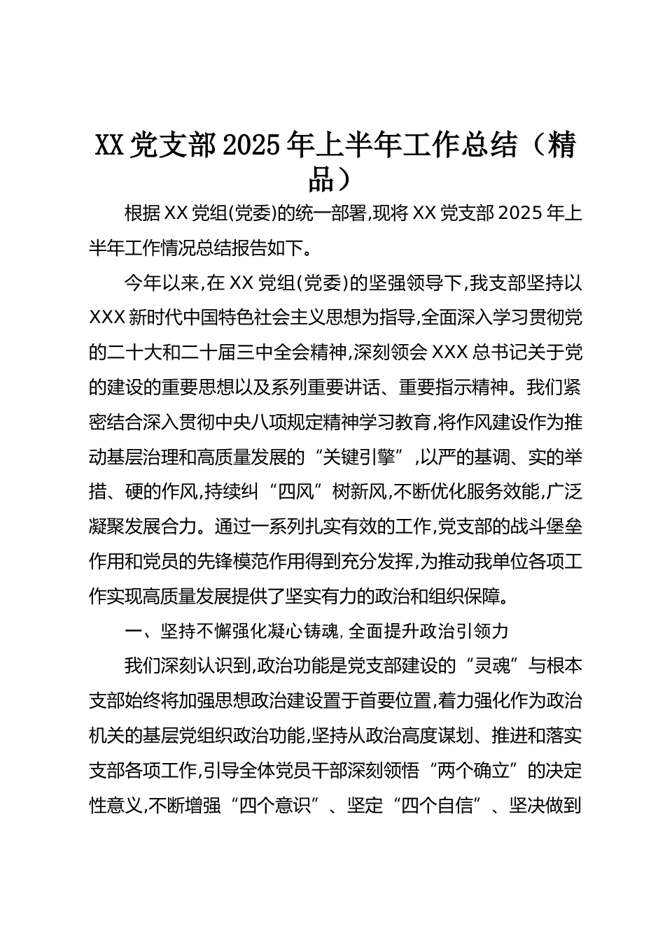 XX黨支部2025年上半年工作總結(jié)(精品)根據(jù)XX黨組(黨委)的統(tǒng)一部署,現(xiàn)將XX黨支部2025年上半年工作情況總結(jié)報(bào)告如下。今年以來,在XX黨組(黨委)的堅(jiān)強(qiáng)領(lǐng)導(dǎo)下,我支部堅(jiān)持以XXX新時(shí)代中國(guó)特色社會(huì)主義思想為指導(dǎo),全面深入學(xué)習(xí)貫徹黨的二十大和二十屆三中全會(huì)精神,深刻領(lǐng)會(huì)XXX總書記關(guān)于黨的建設(shè)的重要思想以及系列重要講話、重要指示精神。我們緊密結(jié)合深入貫徹中央八項(xiàng)規(guī)定精神學(xué)習(xí)教育,將作風(fēng)建設(shè)作為推動(dòng)基層治理和高質(zhì)量發(fā)展的“關(guān)鍵引擎”,以嚴(yán)的基調(diào)、實(shí)的舉措、硬的作風(fēng),持續(xù)糾“四風(fēng)”樹新風(fēng),不斷優(yōu)化服務(wù)效能,廣泛凝聚發(fā)展合力。通過一系列扎實(shí)有效的工作,黨支部的...