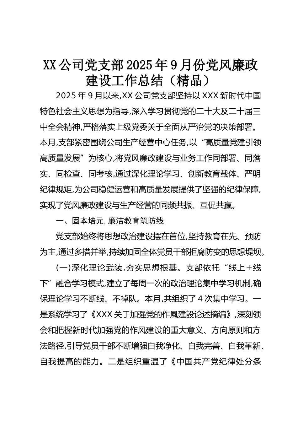 XX公司黨支部2025年9月份黨風(fēng)廉政建設(shè)工作總結(jié)(精品)